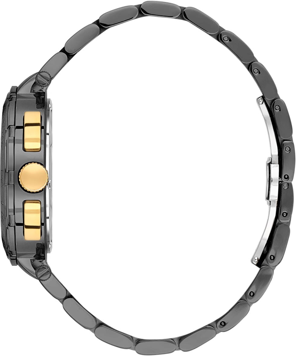 Механизм кварцевый, защищён минеральным стекломМинеральное стеклоМинеральное стекло представляет собой искусственно выращенный минерал кварца. Такое стекло отличается особой устойчивостью к повреждениям и царапинам. Уступает по некоторым качествам сапфировому стеклу.. Конструкция браслета удобна в носке и фиксируется надёжной застёжкой. Эта модель подойдёт мужчине, который ценит сочетание спортивной функциональности и элегантного стиля.