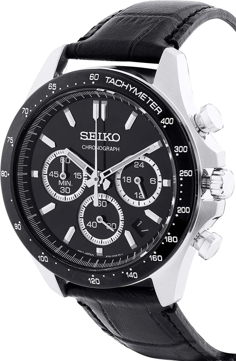 Мужские японские часы-хронографХронографФункция позволяет измерять отрезки времени с особой точностью: часы, минуты, секунды. Верным признаком хронографа является наличие на циферблате 3 дополнительных окошек-счётчиков. с секундомеромСекундомерСекундоме́р — прибор, способный измерять интервалы времени с точностью до долей секунды. Seiko Spirit Chronograph SBTR021 — это великолепное сочетание стиля и функциональности, созданное для современных искателей приключений. Минеральное стеклоМинеральное стеклоМинеральное стекло представляет собой искусственно выращенный минерал кварца. Такое стекло отличается особой устойчивостью к повреждениям и царапинам. Уступает по некоторым качествам сапфировому стеклу. с повышенной прочности Hardlex гарантирует защиту циферблата от царапин, сохраняя их безупречный вид на протяжении долгого времени. Внутри этих часов установлен кварцевый механизм, который обеспечивает высокую точность и надежность, позволяя вам всегда оставаться в курсе времени. Класс водозащиты в 100 метров позволяет вам не только плавать и нырять, но и заниматься разнообразными водными видами спорта, уверенно полагаясь на это надежное устройство, которое выдержит даже самые экстремальные условия. Корпус часов изготовлены из прочной нержавеющей стали, что укрепляет их долговечность и подчеркивает современный дизайн. Неподвижный безельБезельВнешний ободок, закрепляющий стекло. В спортивных часах так называется поворотное кольцо с делениями на циферблате, выполняет роль таймера – замеряет отрезки времени на шкале. Неподвижный безель – элемент декора. Однонаправленно вращающийся безель на дайверских часах позволяет фиксировать моменты погружения и выныривания на поверхность. с PVD-покрытиемPVDУльтратонкое покрытие наносится в технике вакуумного напыления, сочетает в себе нитрид титана особой прочности со слоем золота или оксида хрома. Несёт в себе декоративную или защитную функцию. черного цвета, диаметр 42 мм. Шкала тахиметраТахиметрРазмеченная шкала, располагается на ободке или безеле часов. Тахиметр позволяет рассчитать скорость на определённом участке пути, расстояние измеряется в километрах или милях. по внешнему краю. Удобное окошко даты в позиции между 4 и 5 часов, делает эти часы еще более практичными, позволяя быстро сверять текущую дату. Кроме того, стрелки и метки часов оснащены люминесцентным покрытиемЛюминесцентное покрытиеПозволяет считывать показания времени в темноте. Производители наносят на стрелки, часовые индексы, безель или поверхность циферблата светонакопительный состав, дающий холодное свечение., что обеспечивает отличную видимость даже в условиях низкой освещенности, поэтому вы всегда сможете узнать время, независимо от окружающей среды. Кожаный ремешок на застёжке-бабочке с кнопкамиЗастёжка "бабочка"Такой вид застёжки дополняется предохранителями, помогающими избежать случайного раскрытия браслета. Обладают изящным исполнением. обеспечивает комфорт и удобство в использовании, добавляя завершающий штрих к этому стильному и высокоэффективному аксессуару.