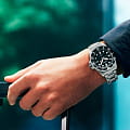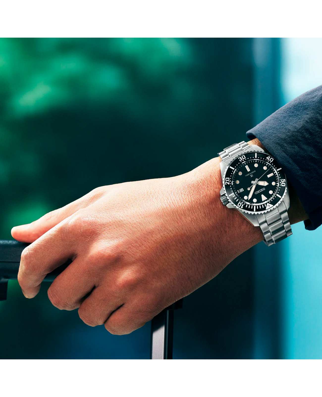 Мужские наручные часы Seiko SNE597P1 из коллекции Prospex сочетают в себе классический дизайн и надежность современных технологий. Модель обладает круглым корпусом диаметром 41 мм, изготовленным из нержавеющей стали, что обеспечивает высокую устойчивость к внешним воздействиям . Толщина корпуса составляет 11,34 мм, а для защиты используется сапфировое стеклоСапфировое стеклоПрочный и надёжный материал из кристалла сапфира синтетического происхождения, характеризующийся особой твёрдостью и устойчивостью к царапинам и повреждениям., обеспечивающее прочную защиту от царапин .  Браслет также выполнен из нержавеющей стали с раскладной застежкойРаскладная застёжкаТакой тип застёжки используется только на браслетах из металла. Она никогда не раскрывается полностью, происходит разделение на 2 и более частей. Раскладывающая застёжка снизит вероятность потери часов к минимуму., гарантирующей комфортное ношение . Циферблат черного цвета украшен текстурой, которая подчеркивает элегантный стиль модели. Часы оснащены функцией отображения даты на позиции «3 часа» .  Водонепроницаемость составляет 200 метров, что позволяет использовать часы для плавания и других водных видов спорта . Часы также оснащены люминесцентным покрытиемЛюминесцентное покрытиеПозволяет считывать показания времени в темноте. Производители наносят на стрелки, часовые индексы, безель или поверхность циферблата светонакопительный состав, дающий холодное свечение. на стрелках и метках, обеспечивающим отличную видимость в темноте .