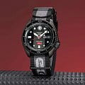 Водозащита 100 метров (10 бар) позволяет использовать часы для плавания и других водных видов спорта. Чёрный нейлоновый ремешок с логотипами Super Cub и Honda и раскладной застёжкойРаскладная застёжкаТакой тип застёжки используется только на браслетах из металла. Она никогда не раскрывается полностью, происходит разделение на 2 и более частей. Раскладывающая застёжка снизит вероятность потери часов к минимуму. обеспечивает комфортное ношение и надёжную фиксацию на запястье. ​​