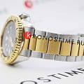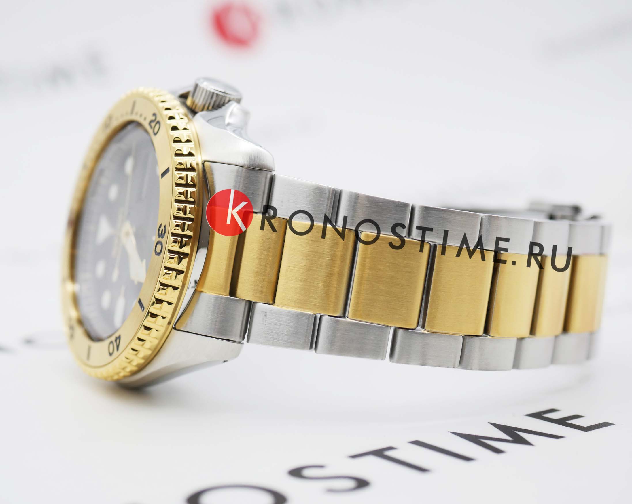 Водозащита 100 метров (10 бар) позволяет использовать часы для плавания и других водных видов спорта. Стальной браслет с двухцветным PVD-покрытиемPVDУльтратонкое покрытие наносится в технике вакуумного напыления, сочетает в себе нитрид титана особой прочности со слоем золота или оксида хрома. Несёт в себе декоративную или защитную функцию. и раскладной застёжкойРаскладная застёжкаТакой тип застёжки используется только на браслетах из металла. Она никогда не раскрывается полностью, происходит разделение на 2 и более частей. Раскладывающая застёжка снизит вероятность потери часов к минимуму. обеспечивает комфортное ношение и надёжную фиксацию на запястье. ​​
