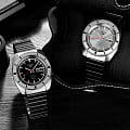 Поворотный безельБезельВнешний ободок, закрепляющий стекло. В спортивных часах так называется поворотное кольцо с делениями на циферблате, выполняет роль таймера – замеряет отрезки времени на шкале. Неподвижный безель – элемент декора. Однонаправленно вращающийся безель на дайверских часах позволяет фиксировать моменты погружения и выныривания на поверхность. изготовлен из стали, что придает часам дополнительную прочность и надежность. Класс водозащиты — 100 метров, что позволяет использовать часы при плавании, нырянии и других водных активностях. Браслет на раскладной застёжкеРаскладная застёжкаТакой тип застёжки используется только на браслетах из металла. Она никогда не раскрывается полностью, происходит разделение на 2 и более частей. Раскладывающая застёжка снизит вероятность потери часов к минимуму. обеспечивает комфортное и безопасное крепление на запястье.