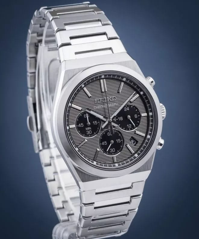 Мужские японские часы Seiko SSB455P1 c хронографомХронографФункция позволяет измерять отрезки времени с особой точностью: часы, минуты, секунды. Верным признаком хронографа является наличие на циферблате 3 дополнительных окошек-счётчиков., кварцевый механизм с высокой точностью. Минеральное стеклоМинеральное стеклоМинеральное стекло представляет собой искусственно выращенный минерал кварца. Такое стекло отличается особой устойчивостью к повреждениям и царапинам. Уступает по некоторым качествам сапфировому стеклу., устойчивое к появлению царапин, обладающее высокой прозрачностью. Класс водозащиты: 100 метров, позволит плавать, нырять и заниматься другими водными видами спорта. Корпус и браслет часов изготовлен из стали. Неподвижный безельБезельВнешний ободок, закрепляющий стекло. В спортивных часах так называется поворотное кольцо с делениями на циферблате, выполняет роль таймера – замеряет отрезки времени на шкале. Неподвижный безель – элемент декора. Однонаправленно вращающийся безель на дайверских часах позволяет фиксировать моменты погружения и выныривания на поверхность. со шкалой тахиметраТахиметрРазмеченная шкала, располагается на ободке или безеле часов. Тахиметр позволяет рассчитать скорость на определённом участке пути, расстояние измеряется в километрах или милях.. Стрелки и метки с люминесцентным покрытиемЛюминесцентное покрытиеПозволяет считывать показания времени в темноте. Производители наносят на стрелки, часовые индексы, безель или поверхность циферблата светонакопительный состав, дающий холодное свечение. LumiBrite. Браслет на раскладной застёжкеРаскладная застёжкаТакой тип застёжки используется только на браслетах из металла. Она никогда не раскрывается полностью, происходит разделение на 2 и более частей. Раскладывающая застёжка снизит вероятность потери часов к минимуму. с кнопками. СекундомерСекундомерСекундоме́р — прибор, способный измерять интервалы времени с точностью до долей секунды.. Окошко даты находится в положении между 4 и 5 часов.