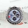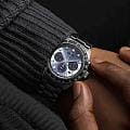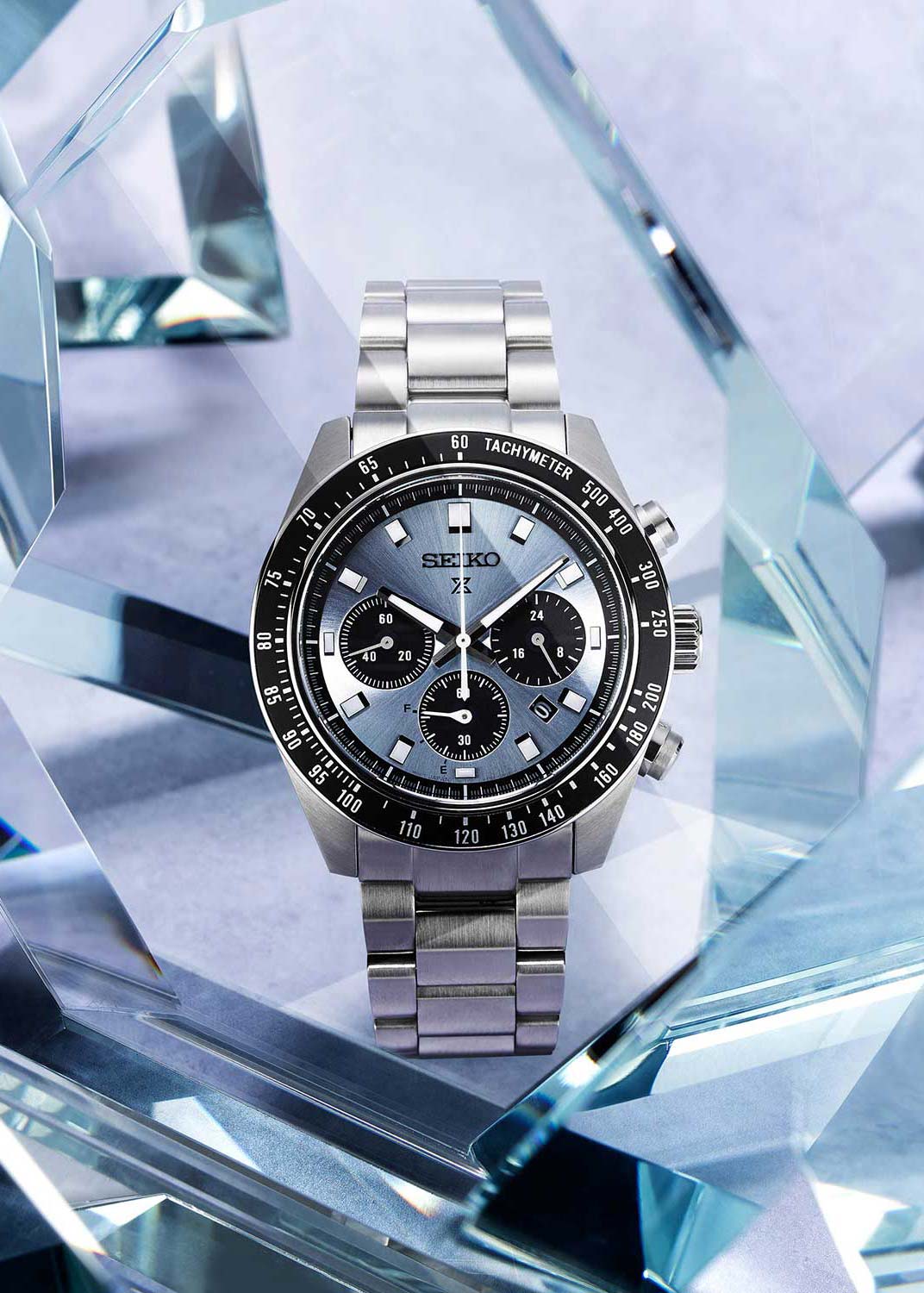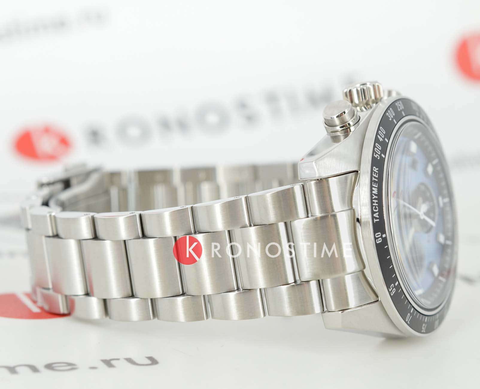 Модель Seiko SSC935P1 из коллекции Prospex Speedtimer — это спортивный солнечный хронограф с выразительным дизайном и высокой функциональностью. Корпус диаметром 41,4 мм выполнен из нержавеющей стали и оснащён завинчивающейся задней крышкой и заводной головкой, обеспечивая водозащиту до 100 метров. Фиксированный алюминиевый тахиметрический безельТахиметрРазмеченная шкала, располагается на ободке или безеле часов. Тахиметр позволяет рассчитать скорость на определённом участке пути, расстояние измеряется в километрах или милях. позволяет производить измерения скорости. Циферблат насыщенного голубого оттенка с солнечным финишем дополнен тремя чёрными счётчиками: 24-часовым, малой секундной стрелкой и хронографом на 60 минут. Стрелки и индексы покрыты люминесцентным покрытиемЛюминесцентное покрытиеПозволяет считывать показания времени в темноте. Производители наносят на стрелки, часовые индексы, безель или поверхность циферблата светонакопительный состав, дающий холодное свечение. LumiBrite для превосходной видимости в тёмное время суток. Защиту циферблата обеспечивает выпуклое сапфировое стеклоСапфировое стеклоПрочный и надёжный материал из кристалла сапфира синтетического происхождения, характеризующийся особой твёрдостью и устойчивостью к царапинам и повреждениям. с внутренним антибликовым покрытиемАнтибликовое покрытиеСлой оксида металла в 0,13-0,3 микрон, благодаря которому стекло часов не бликует и не отражает свет. Антибликовое покрытие уменьшает отражение света в 10 раз, обеспечивая отличную читаемость показателей циферблата., устойчивое к царапинам и бликам. Внутри установлен солнечный кварцевый калибр V192 с функциями хронографаХронографФункция позволяет измерять отрезки времени с особой точностью: часы, минуты, секунды. Верным признаком хронографа является наличие на циферблате 3 дополнительных окошек-счётчиков., индикацией 24 часов, даты и запаса хода. Полного заряда хватает до 6 месяцев автономной работы. Браслет из нержавеющей стали надёжно фиксируется при помощи раскладной застёжкиРаскладная застёжкаТакой тип застёжки используется только на браслетах из металла. Она никогда не раскрывается полностью, происходит разделение на 2 и более частей. Раскладывающая застёжка снизит вероятность потери часов к минимуму. с кнопками.