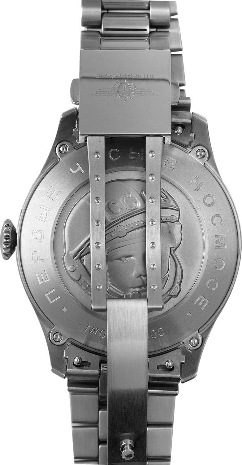 Штурманские мужские российские механические часы 2416/3805147B с механизмом высокой точности. Класс водозащиты: 50 метров, позволит защитить корпус от случайных брызг или капель дождя. Корпус часов изготовлен из стали. Сапфировое стеклоСапфировое стеклоПрочный и надёжный материал из кристалла сапфира синтетического происхождения, характеризующийся особой твёрдостью и устойчивостью к царапинам и повреждениям. устойчивое к мелким механическим повреждениям. Стальной браслет с раскладной застёжкойРаскладная застёжкаТакой тип застёжки используется только на браслетах из металла. Она никогда не раскрывается полностью, происходит разделение на 2 и более частей. Раскладывающая застёжка снизит вероятность потери часов к минимуму.. Стрелки и метки с люминесцентным покрытиемЛюминесцентное покрытиеПозволяет считывать показания времени в темноте. Производители наносят на стрелки, часовые индексы, безель или поверхность циферблата светонакопительный состав, дающий холодное свечение.. Задняя крышка украшена портретом Юрия Гагарина и крепится на 4-х винтах.