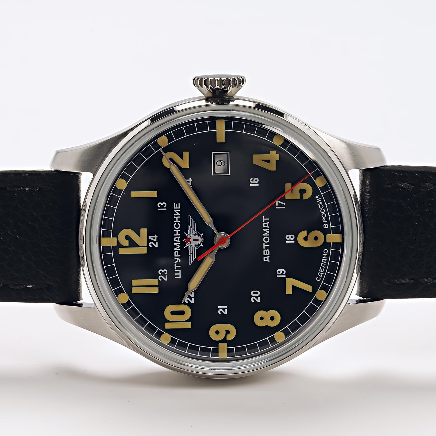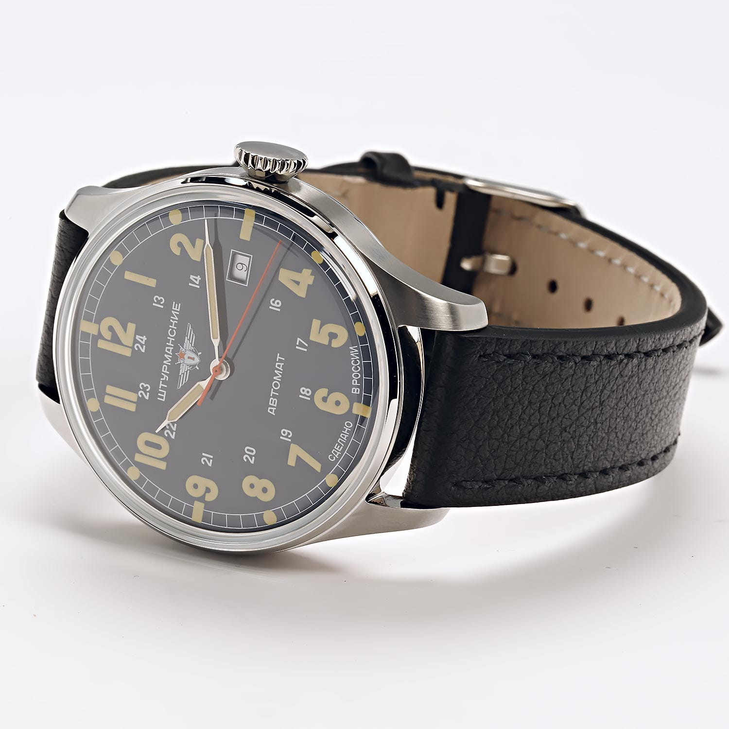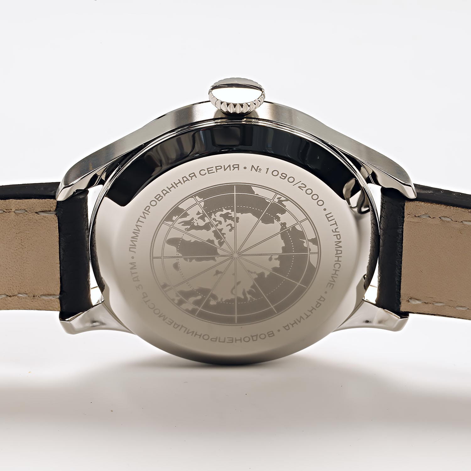 Штурманские мужские российские механические часы с механизмом высокой точности. Класс водозащиты: 30 метров, позволит защитить корпус от случайных брызг или капель дождя. Корпус часов изготовлен из стали. Кожаный ремешок на стандартной застёжке. Стрелки и метки с люминесцентным покрытиемЛюминесцентное покрытиеПозволяет считывать показания времени в темноте. Производители наносят на стрелки, часовые индексы, безель или поверхность циферблата светонакопительный состав, дающий холодное свечение..  Окошко даты находятся в положении 3 часа. Задняя крышка украшена картой Арктики.