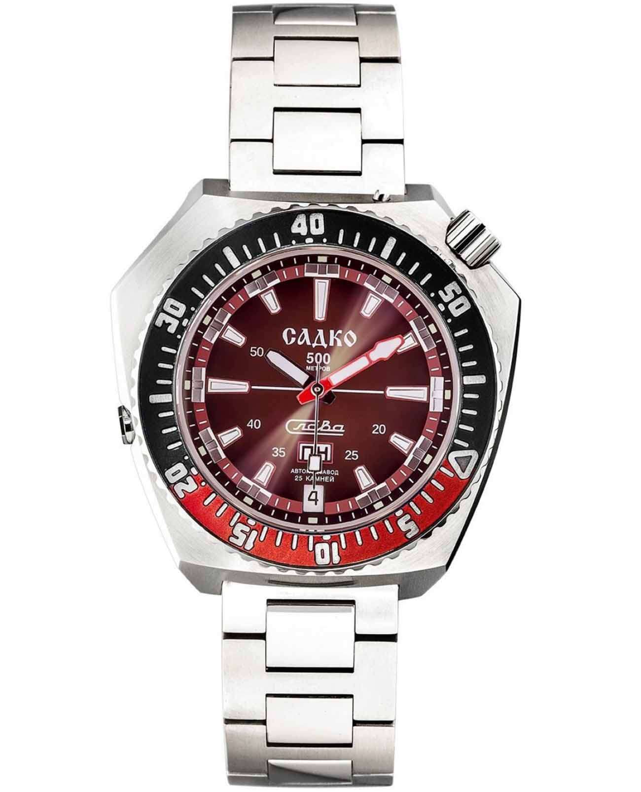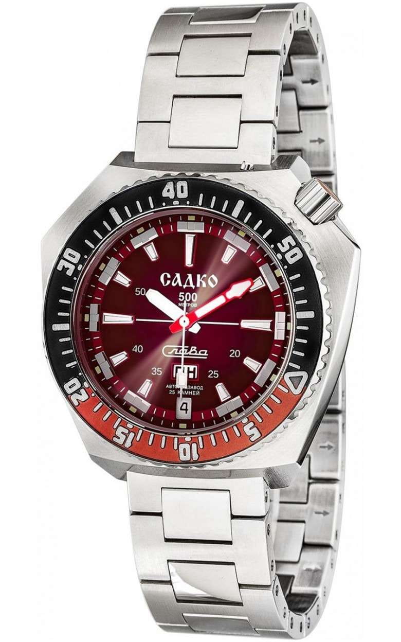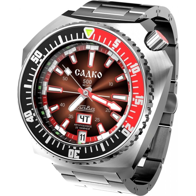 Стильные часы Слава Садко 5000170/100-2427 — станут надежным спутником как в повседневной жизни, так и при покорении морских глубин. Эти часы, созданные в России, оснащены механическим механизмом Слава 2427 с автоподзаводом, который обеспечивает точность и надежность. Корпус выполнен из высококачественной стали 316L. Поворотный безельБезельВнешний ободок, закрепляющий стекло. В спортивных часах так называется поворотное кольцо с делениями на циферблате, выполняет роль таймера – замеряет отрезки времени на шкале. Неподвижный безель – элемент декора. Однонаправленно вращающийся безель на дайверских часах позволяет фиксировать моменты погружения и выныривания на поверхность. часов с IP-покрытиемIP-покрытиеМетод ионного напыления. Демонстрирует повышенную устойчивость к истиранию, окислению и химическим веществам. Под воздействием высокого давления и температуры около 1500°C молекулы металла надёжно соединяются с частицами корпуса часов. красного и черного цвета придаёт модели особую элегантность и долговечность. Яркий красный циферблат с метками в виде штрихов надежно защищён сапфировым стекломСапфировое стеклоПрочный и надёжный материал из кристалла сапфира синтетического происхождения, характеризующийся особой твёрдостью и устойчивостью к царапинам и повреждениям., толщина которого составляет 3 мм. Заводная головка с защитой, расположенная в положении 2 часа, и литой стальной браслет с застежкой «бабочка»Застёжка "бабочка"Такой вид застёжки дополняется предохранителями, помогающими избежать случайного раскрытия браслета. Обладают изящным исполнением. обеспечивают комфорт и удобство в использовании. Эти часы имеют водозащиту 500WR, позволяя погружаться на глубину до 50 атмосфер, что делает их идеальными для дайвинга. Автоматический гелиевый клапан добавляет дополнительную надежность при подводных приключениях. Функциональность часов дополнена календарём с отображением числа и дня недели, который удобно расположен в позиции 6 часов. Кнопка быстрого перевода календаря делает настройку простой и лёгкой. Стрелки и метки обладают люминесцентным покрытиемЛюминесцентное покрытиеПозволяет считывать показания времени в темноте. Производители наносят на стрелки, часовые индексы, безель или поверхность циферблата светонакопительный состав, дающий холодное свечение., которое светится в темноте после зарядки на свету, обеспечивая отличную видимость в любых условиях. Каждый экземпляр из лимитированной серии в 500 штук уникален и имеет номер на задней крышке, украшенной объёмным изображением, выполненным методом чеканки. Механизм часов поддерживает 25 камней и работает с частотой 18000 полуколебаний в час, предлагая запас хода до 40 часов и возможность ручного завода. Противоударное устройство оси баланса добавляет уверенности в их долговечности. Эти часы — идеальный выбор для тех, кто ценит стиль, надежность и функциональность в одном аксессуаре.