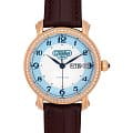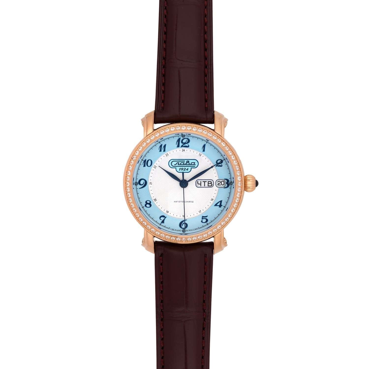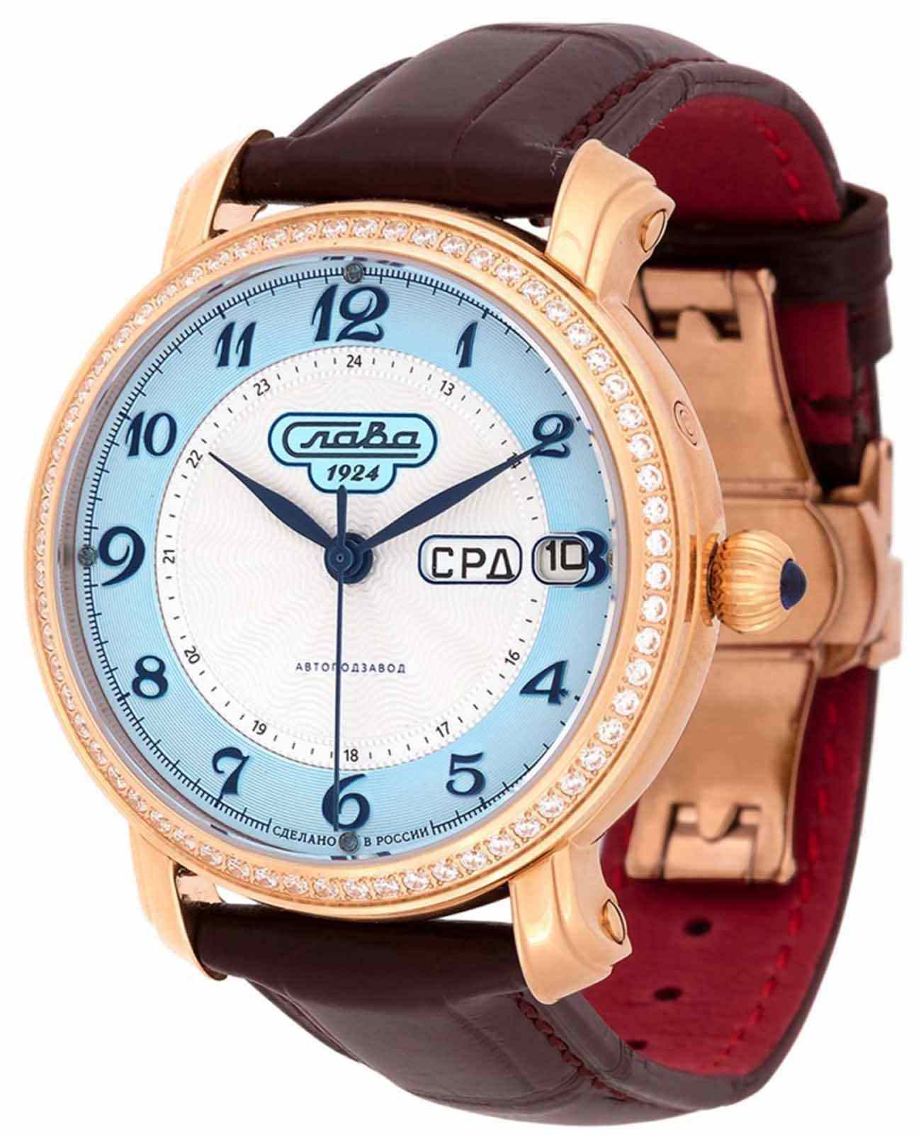 Наручные часы Слава Слава России 7443616/300-2427-68 — воплощение классического стиля и исключительного качества, произведенные в России. Эта модель из лимитированной коллекции станет великолепным дополнением к вашему образу. Часы оснащены надежным механическим механизмом "Слава 2427" с автоподзаводом, обеспечивающим точный ход и оснащены двойным календарем, что позволяет всегда быть в курсе текущей даты. Корпус из нержавеющей стали с золотистым PVDPVDУльтратонкое покрытие наносится в технике вакуумного напыления, сочетает в себе нитрид титана особой прочности со слоем золота или оксида хрома. Несёт в себе декоративную или защитную функцию.-покрытием диаметром 41 мм и толщиной 14,2 мм отличается высокой прочностью и водозащитой до 5 ATM.  БезельБезельВнешний ободок, закрепляющий стекло. В спортивных часах так называется поворотное кольцо с делениями на циферблате, выполняет роль таймера – замеряет отрезки времени на шкале. Неподвижный безель – элемент декора. Однонаправленно вращающийся безель на дайверских часах позволяет фиксировать моменты погружения и выныривания на поверхность. часов с вставками из камней циркона. Серебристо-голубой циферблат с арабскими цифрами защищен сапфировым стекломСапфировое стеклоПрочный и надёжный материал из кристалла сапфира синтетического происхождения, характеризующийся особой твёрдостью и устойчивостью к царапинам и повреждениям., устойчивым к царапинам, что позволяет надолго сохранить безупречный вид часов. На 3 часах расположено окошко с указателем даты и дня недели. Кожаный ремень из крокодила с застежкой «бабочка»Застёжка "бабочка"Такой вид застёжки дополняется предохранителями, помогающими избежать случайного раскрытия браслета. Обладают изящным исполнением. добавляет элегантности и комфорта, создавая ощущение роскоши и изысканности. Эта модель станет идеальным выбором для тех, кто ценит традиции и высокое качество в сочетании с современным дизайном.