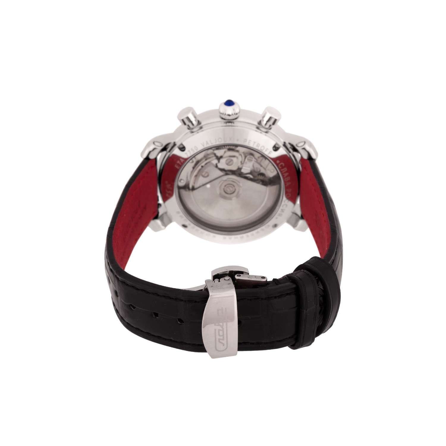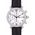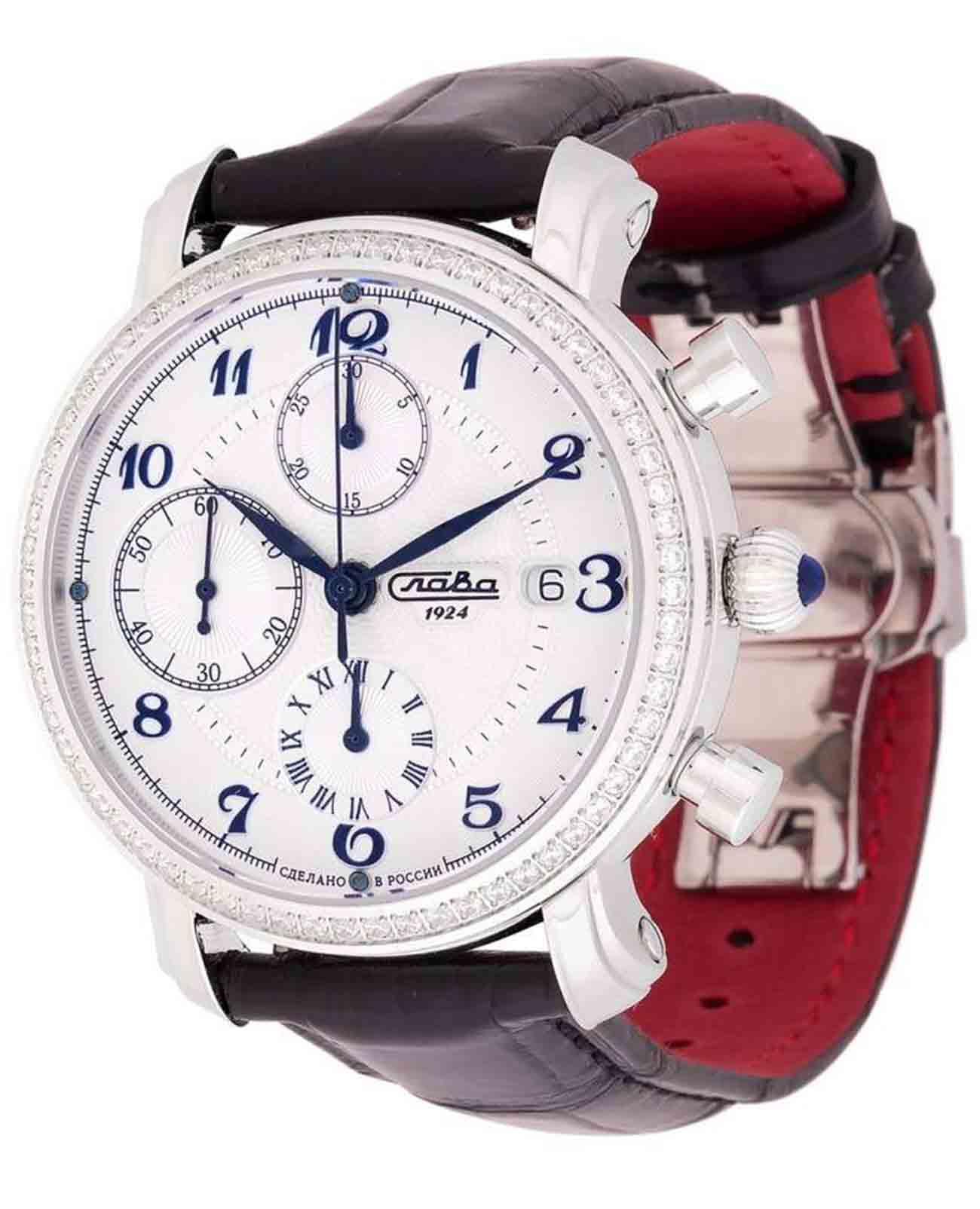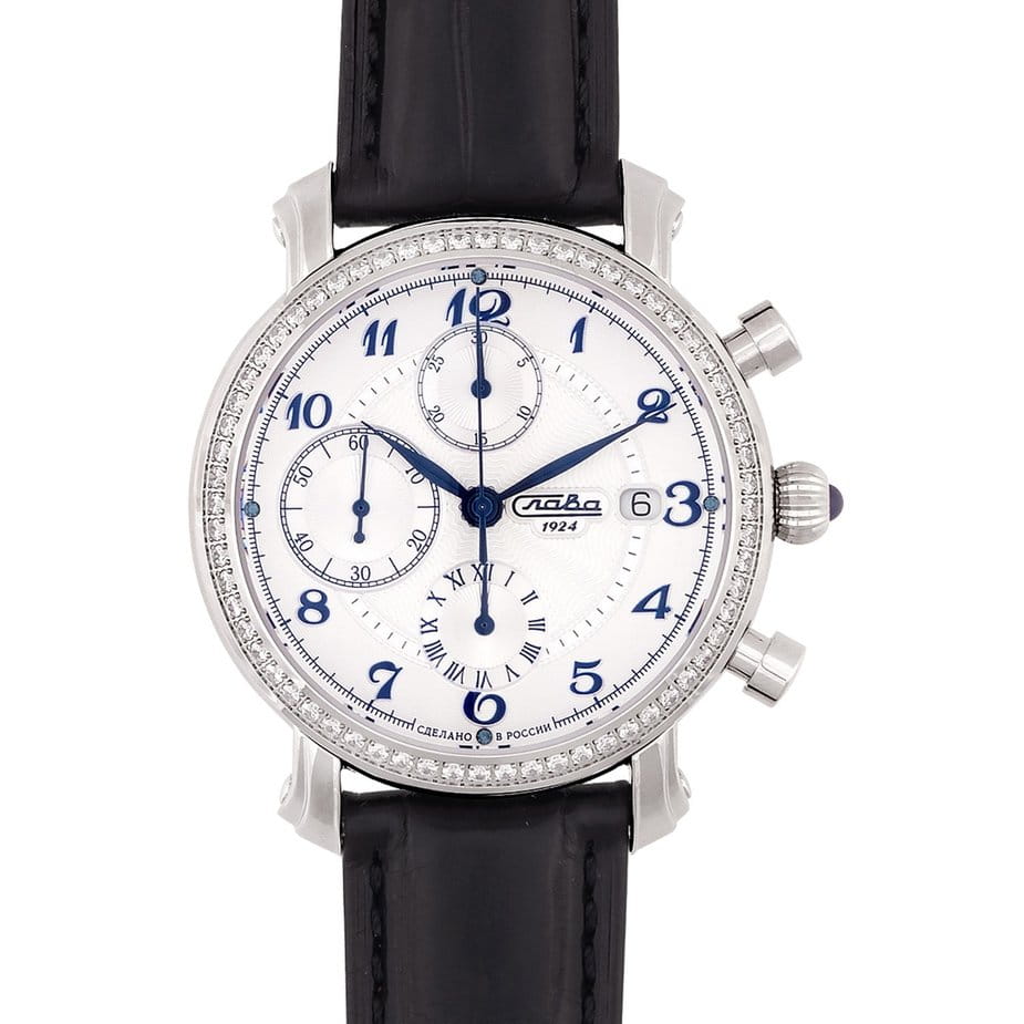 Российские механические наручные часы-хронографХронографФункция позволяет измерять отрезки времени с особой точностью: часы, минуты, секунды. Верным признаком хронографа является наличие на циферблате 3 дополнительных окошек-счётчиков. с секундомеромСекундомерСекундоме́р — прибор, способный измерять интервалы времени с точностью до долей секунды. Слава Слава России 7450618/300-7750-68 — воплощение классического стиля и исключительного качества, произведенные в России. Эта модель из лимитированной коллекции, выпущенной в количестве всего 300 экземпляров, станет великолепным дополнением к вашему образу. Часы оснащены надежным механическим механизмом Valjoux ETA 7750 с автоподзаводом, обеспечивающим точный ход. Корпус из нержавеющей стали с родиевым покрытием диаметром 41 мм и толщиной 14,2 мм отличается высокой прочностью и водозащитой до 5 ATM. БезельБезельВнешний ободок, закрепляющий стекло. В спортивных часах так называется поворотное кольцо с делениями на циферблате, выполняет роль таймера – замеряет отрезки времени на шкале. Неподвижный безель – элемент декора. Однонаправленно вращающийся безель на дайверских часах позволяет фиксировать моменты погружения и выныривания на поверхность. часов с вставками из камней циркона. Серебристый циферблат с арабскими цифрами защищен сапфировым стекломСапфировое стеклоПрочный и надёжный материал из кристалла сапфира синтетического происхождения, характеризующийся особой твёрдостью и устойчивостью к царапинам и повреждениям., устойчивым к царапинам, что позволяет надолго сохранить безупречный вид часов. На 3 часах расположено окошко с указателем даты и дня недели. Кожаный ремень с застежкой «бабочка»Застёжка "бабочка"Такой вид застёжки дополняется предохранителями, помогающими избежать случайного раскрытия браслета. Обладают изящным исполнением. добавляет элегантности и комфорта, создавая ощущение роскоши и изысканности. Эта модель станет идеальным выбором для тех, кто ценит традиции и высокое качество в сочетании с современным дизайном.