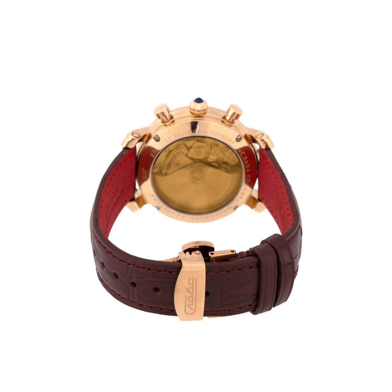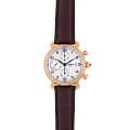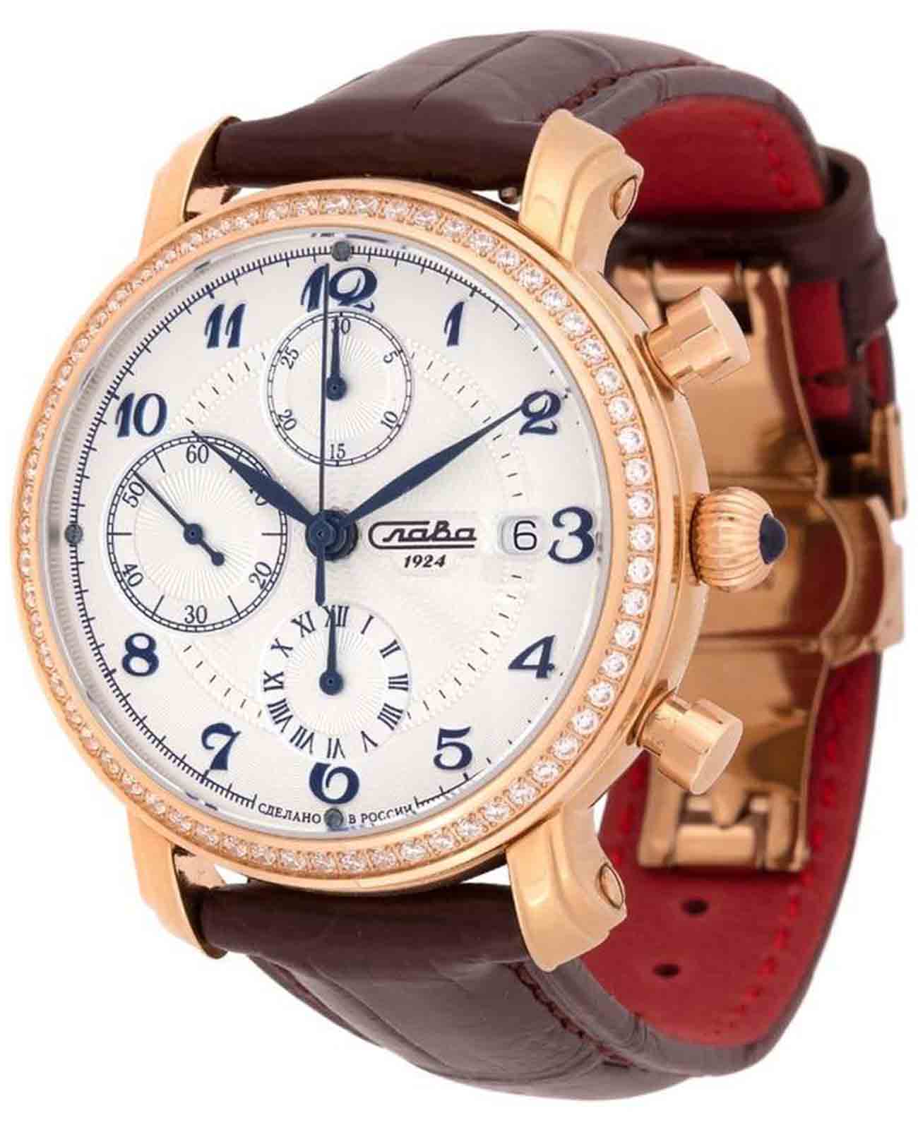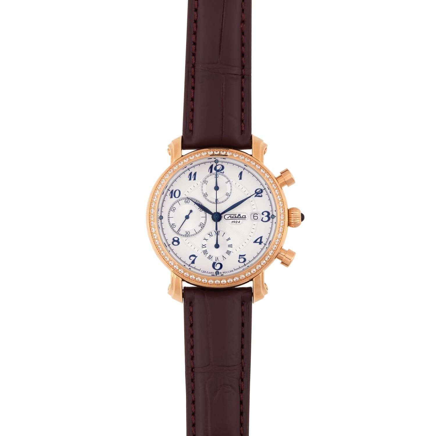 Российские механические наручные часы-хронографХронографФункция позволяет измерять отрезки времени с особой точностью: часы, минуты, секунды. Верным признаком хронографа является наличие на циферблате 3 дополнительных окошек-счётчиков. с секундомеромСекундомерСекундоме́р — прибор, способный измерять интервалы времени с точностью до долей секунды. Слава Слава России 7453618/300-7750-68 — воплощение классического стиля и исключительного качества, произведенные в России. Эта модель из лимитированной коллекции, выпущенной в количестве всего 300 экземпляров, станет великолепным дополнением к вашему образу. Часы оснащены надежным механическим механизмом Valjoux ETA 7750 с автоподзаводом, обеспечивающим точный ход. Корпус из нержавеющей стали с золотистым PVDPVDУльтратонкое покрытие наносится в технике вакуумного напыления, сочетает в себе нитрид титана особой прочности со слоем золота или оксида хрома. Несёт в себе декоративную или защитную функцию.-покрытием диаметром 41 мм и толщиной 14,2 мм отличается высокой прочностью и водозащитой до 5 ATM. БезельБезельВнешний ободок, закрепляющий стекло. В спортивных часах так называется поворотное кольцо с делениями на циферблате, выполняет роль таймера – замеряет отрезки времени на шкале. Неподвижный безель – элемент декора. Однонаправленно вращающийся безель на дайверских часах позволяет фиксировать моменты погружения и выныривания на поверхность. часов с вставками из камней циркона. Серебристый циферблат с арабскими цифрами защищен сапфировым стекломСапфировое стеклоПрочный и надёжный материал из кристалла сапфира синтетического происхождения, характеризующийся особой твёрдостью и устойчивостью к царапинам и повреждениям., устойчивым к царапинам, что позволяет надолго сохранить безупречный вид часов. На 3 часах расположено окошко с указателем даты и дня недели. Кожаный ремень с застежкой «бабочка»Застёжка "бабочка"Такой вид застёжки дополняется предохранителями, помогающими избежать случайного раскрытия браслета. Обладают изящным исполнением. добавляет элегантности и комфорта, создавая ощущение роскоши и изысканности. Эта модель станет идеальным выбором для тех, кто ценит традиции и высокое качество в сочетании с современным дизайном.