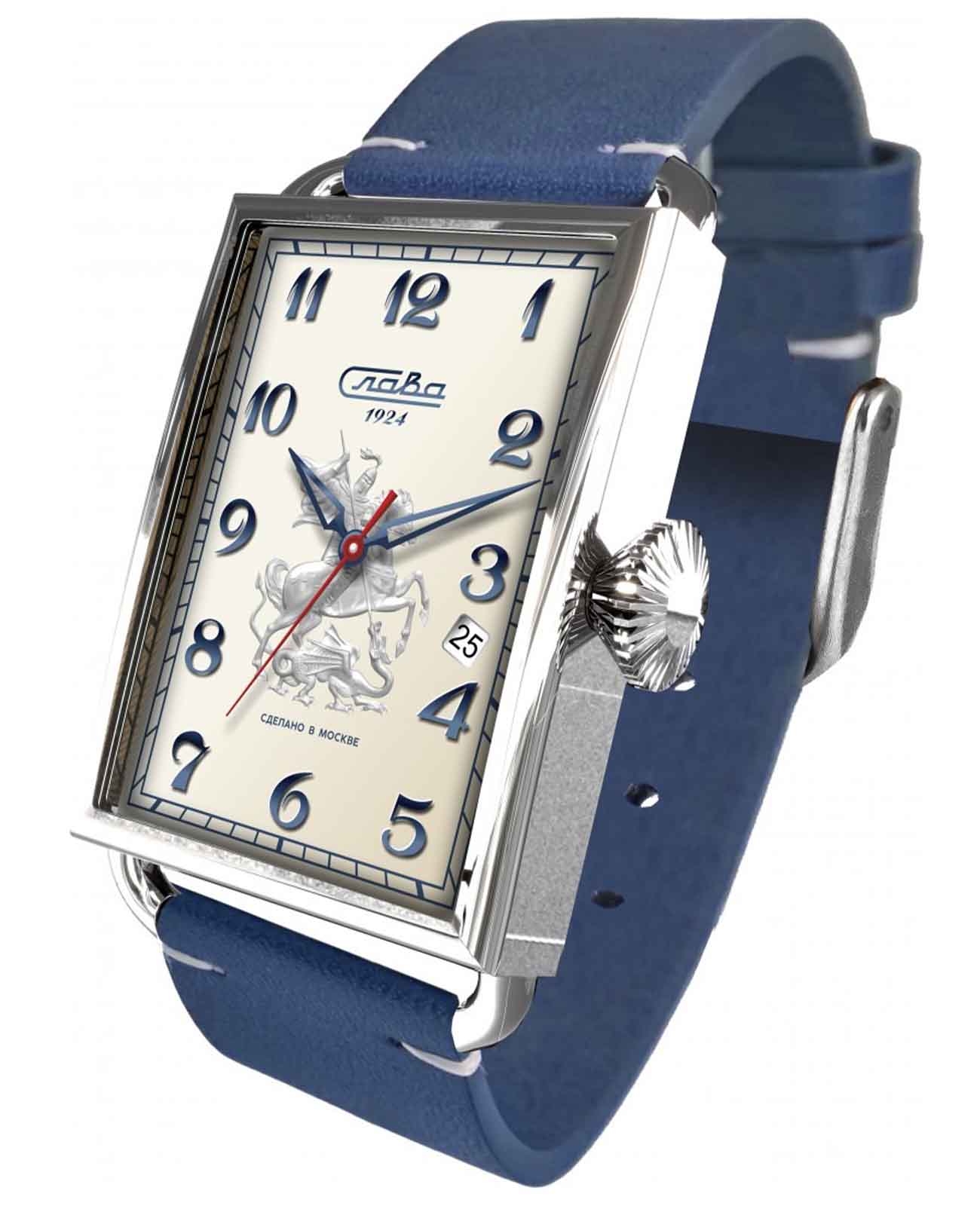 Часы Слава Москва 8700782/300-2414 — это воплощение элегантности и стиля, которое станет идеальным дополнением к вашему деловому гардеробу. Созданные в России, они оснащены надежным механическим механизмом калибра Слава 2414. Корпус выполнен из высококачественной стали, что обеспечивает долговечность и изысканный внешний вид. Бежевый циферблат украшен изображением Георгия Победоносца и защищен прочным сапфировым стекломСапфировое стеклоПрочный и надёжный материал из кристалла сапфира синтетического происхождения, характеризующийся особой твёрдостью и устойчивостью к царапинам и повреждениям., которое устойчиво к царапинам. Арабские цифры и окошко даты, расположенное между отметками 3 и 4 часа, добавляют функциональности и удобства в использовании. Задняя крышка, крепящаяся на 4 винтах, украшена надписью «Москва», подчеркивая уникальность и оригинальность модели. Кожаный ремешок с классической застежкой и системой быстрой замены не только обеспечивает комфорт, но и позволяет легко менять его по вашему желанию. Часы обладают водозащитой 50WR, что делает их подходящими для ежедневного ношения. Компактные габариты и вес в 70 грамм делают их удобными и практически незаметными на запястье. Эта лимитированная серия выпущена в количестве всего 500 экземпляров, что придает особую ценность и эксклюзивность вашему выбору. Часы поставляются в стильной подарочной упаковке, что делает их отличным подарком для ценителей высокого качества и утонченного дизайна.