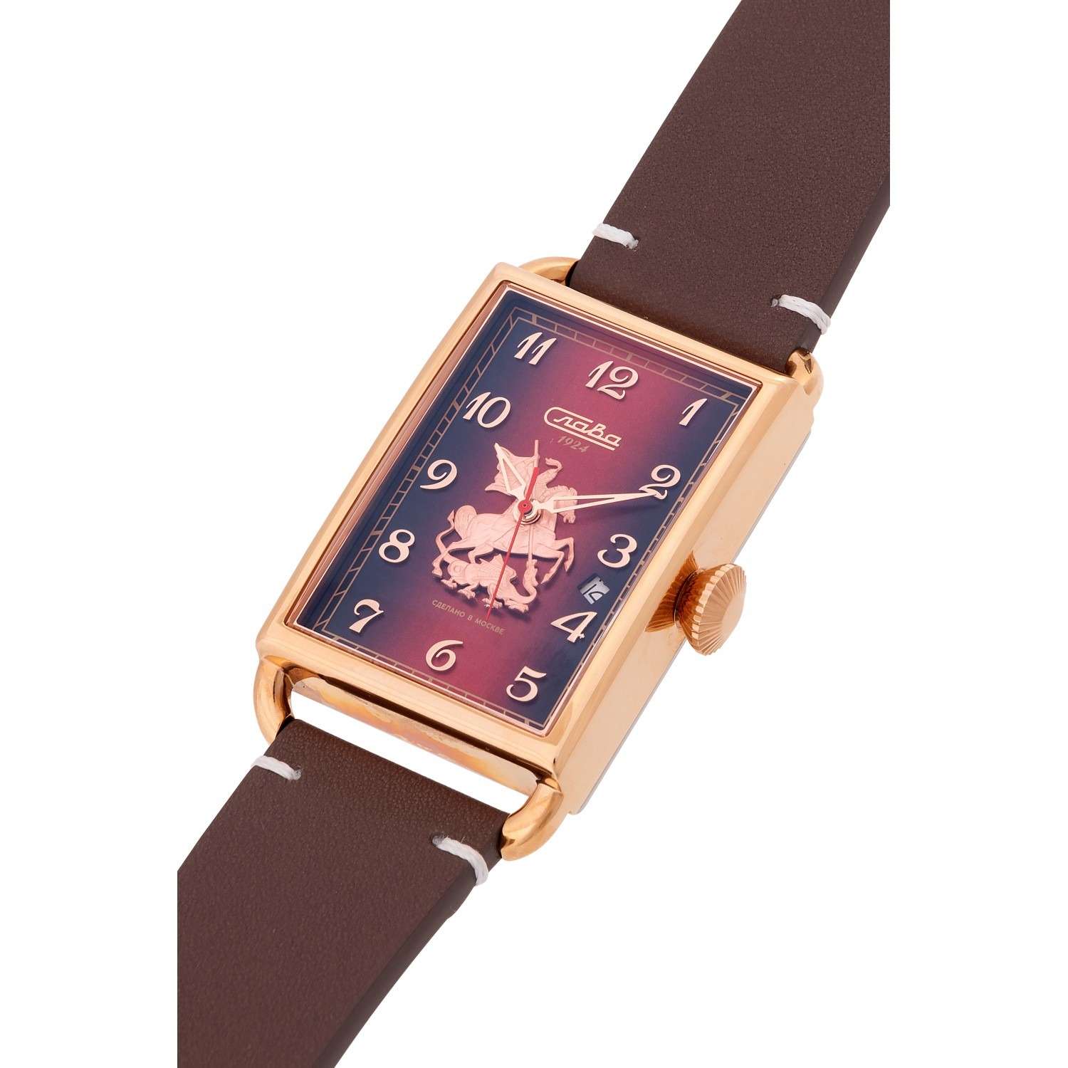 Часы Слава Москва 8703735/300-2414 — это воплощение элегантности и стиля, которое станет идеальным дополнением к вашему деловому гардеробу. Созданные в России, они оснащены надежным механическим механизмом калибра Слава 2414. Корпус выполнен из высококачественной стали с PVDPVDУльтратонкое покрытие наносится в технике вакуумного напыления, сочетает в себе нитрид титана особой прочности со слоем золота или оксида хрома. Несёт в себе декоративную или защитную функцию. покрытием, что обеспечивает долговечность и изысканный внешний вид. Красный циферблат украшен изображением Георгия Победоносца и защищен прочным сапфировым стекломСапфировое стеклоПрочный и надёжный материал из кристалла сапфира синтетического происхождения, характеризующийся особой твёрдостью и устойчивостью к царапинам и повреждениям., которое устойчиво к царапинам. Арабские цифры и окошко даты, расположенное между отметками 3 и 4 часа, добавляют функциональности и удобства в использовании. Задняя крышка, крепящаяся на 4 винтах, украшена надписью «Москва», подчеркивая уникальность и оригинальность модели. Кожаный ремешок с классической застежкой и системой быстрой замены не только обеспечивает комфорт, но и позволяет легко менять его по вашему желанию. Часы обладают водозащитой 50WR, что делает их подходящими для ежедневного ношения. Компактные габариты и вес в 70 грамм делают их удобными и практически незаметными на запястье. Эта лимитированная серия выпущена в количестве всего 500 экземпляров, что придает особую ценность и эксклюзивность вашему выбору. Часы поставляются в стильной подарочной упаковке, что делает их отличным подарком для ценителей высокого качества и утонченного дизайна.