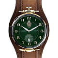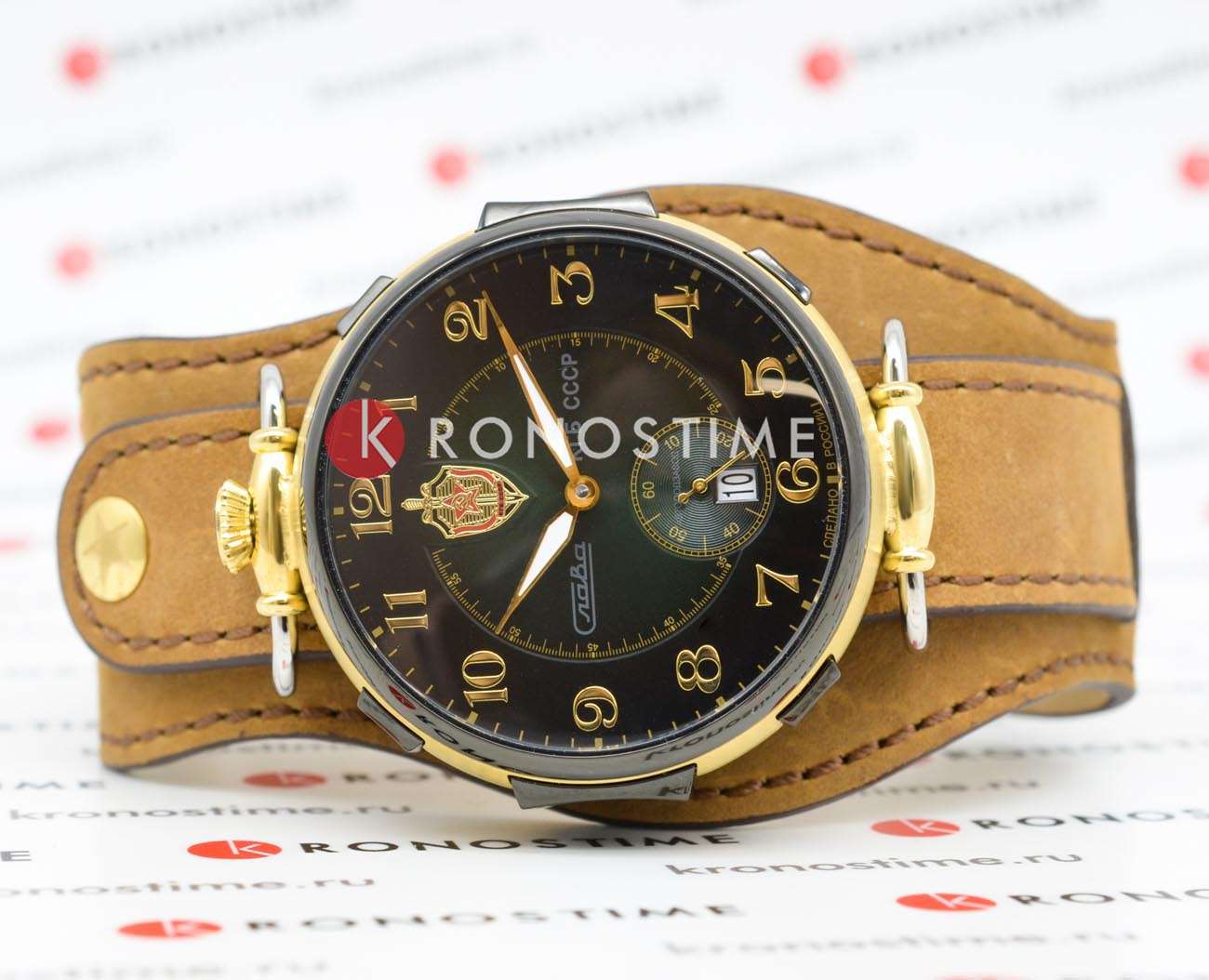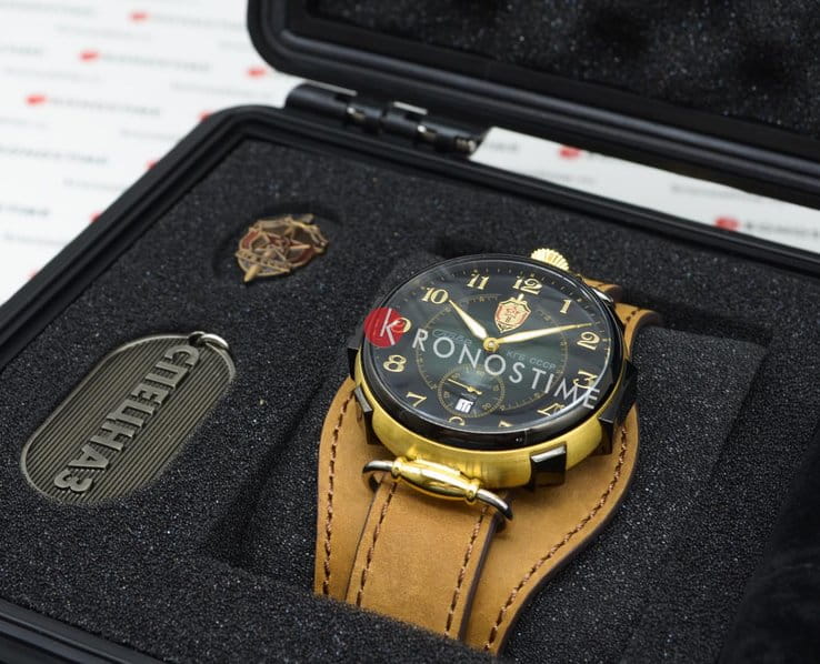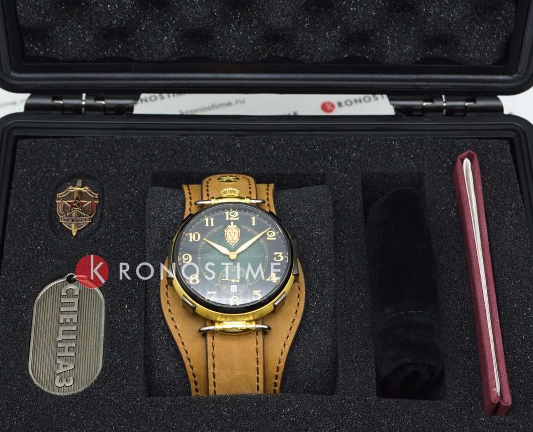 Модель 9624429/300-2555 от «Слава» — коллекционные механические часы с автоподзаводом, вдохновлённые эстетикой КГБ СССР. Корпус из нержавеющей стали с золотистым покрытием IP-покрытиемIP-покрытиеМетод ионного напыления. Демонстрирует повышенную устойчивость к истиранию, окислению и химическим веществам. Под воздействием высокого давления и температуры около 1500°C молекулы металла надёжно соединяются с частицами корпуса часов. и зелёный циферблат подчёркивают винтажный характер модели. Механизм SeaGull 2555 обеспечивает 42 часа запаса хода. Циферблат защищён минеральным стекломМинеральное стеклоМинеральное стекло представляет собой искусственно выращенный минерал кварца. Такое стекло отличается особой устойчивостью к повреждениям и царапинам. Уступает по некоторым качествам сапфировому стеклу., а натуральный кожаный ремешок на стандартной застежке обеспечивает комфортную посадку.