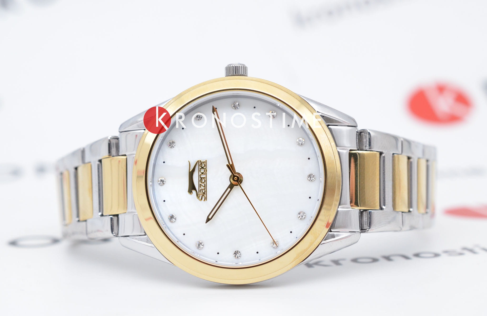 Женские наручные часы Slazenger SL.09.2013.3.04 из коллекции, сочетающей элегантность и практичность в классическом дизайне. Модель обладает круглым корпусом диаметром 35 мм, изготовленным из суперметалла, что обеспечивает высокую устойчивость к внешним воздействиям. БезельБезельВнешний ободок, закрепляющий стекло. В спортивных часах так называется поворотное кольцо с делениями на циферблате, выполняет роль таймера – замеряет отрезки времени на шкале. Неподвижный безель – элемент декора. Однонаправленно вращающийся безель на дайверских часах позволяет фиксировать моменты погружения и выныривания на поверхность. с IP-покрытиемIP-покрытиеМетод ионного напыления. Демонстрирует повышенную устойчивость к истиранию, окислению и химическим веществам. Под воздействием высокого давления и температуры около 1500°C молекулы металла надёжно соединяются с частицами корпуса часов.. Циферблат украшен кристаллами в виде фианитов, добавляя модели особую роскошь и шарм. Для защиты используется минеральное стеклоМинеральное стеклоМинеральное стекло представляет собой искусственно выращенный минерал кварца. Такое стекло отличается особой устойчивостью к повреждениям и царапинам. Уступает по некоторым качествам сапфировому стеклу., обеспечивающее надежную защиту от царапин. Часы комплектуются браслетом из нержавеющей стали с комбинированным цветом серебро с золотом и раскладной застежкойРаскладной замокДанный вариант застежки используется только на часах с металлическим браслетом. Отличительная особенность такого крепления в том, что длина браслета становится универсальной и вы можете самостоятельно отрегулировать нужный вам размер – застежка просто двигается по браслету часов., гарантирующей комфортное ношение. Модель работает на кварцевом механизме, что обеспечивает высокую точность хода времени. Водонепроницаемость часов составляет 3 атмосферы (30 метров), подходящую для ежедневного использования, но не рекомендуется для плавания или дайвинга.