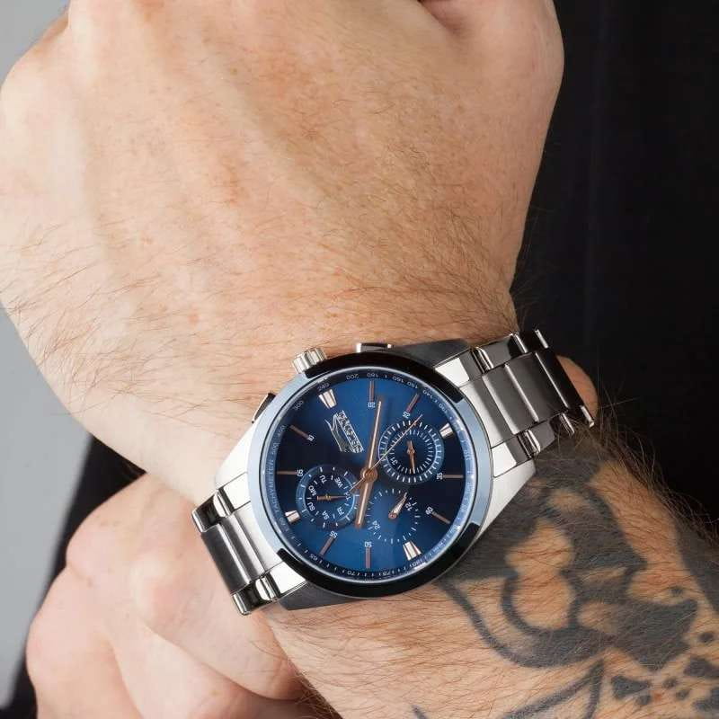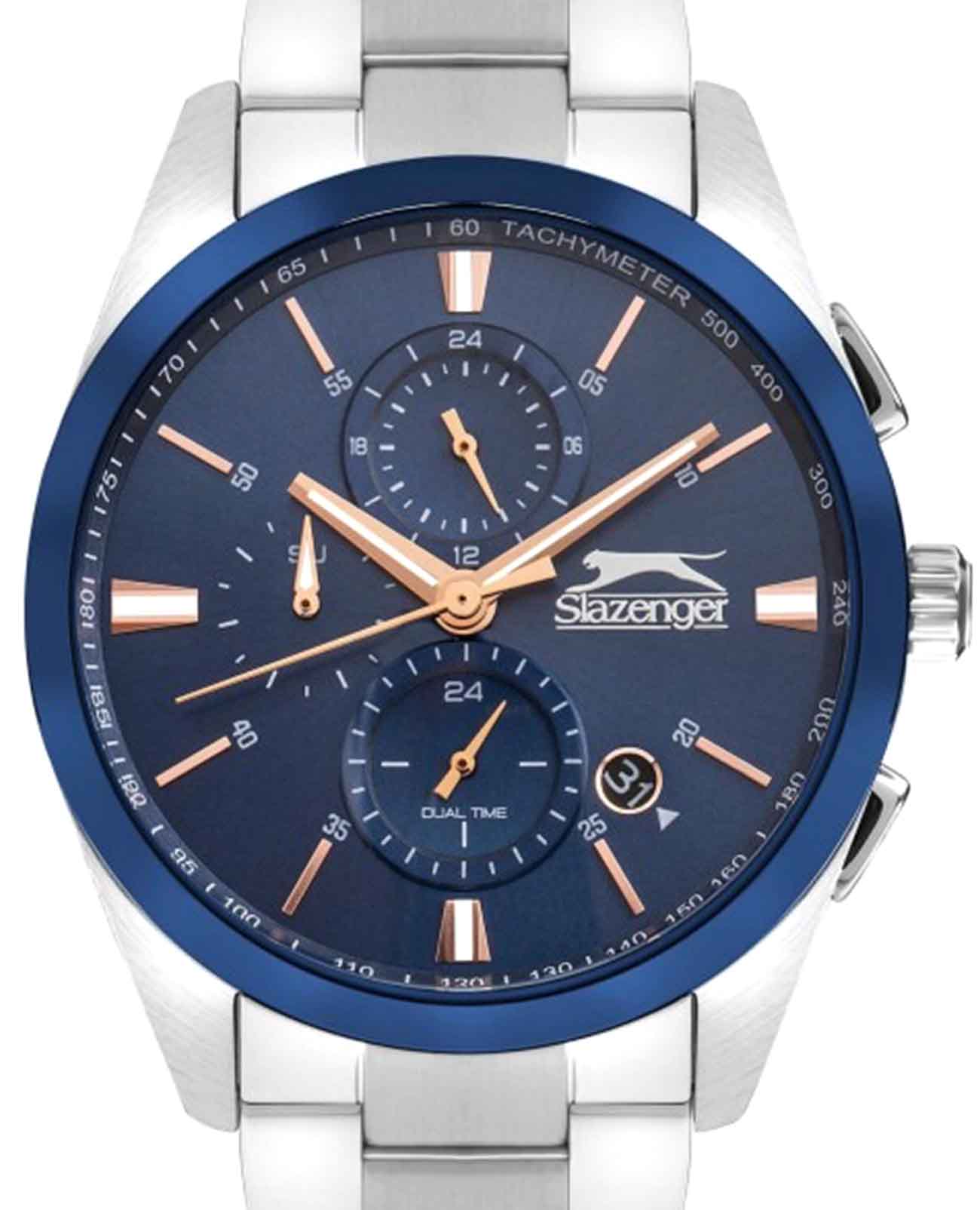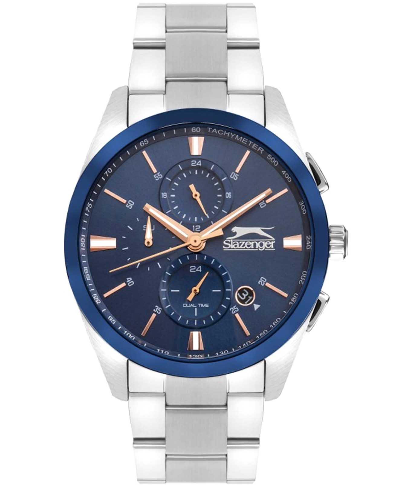 Часы Slazenger SL.09.2215.2.04 представляют собой стильные мужские наручные часы, которые сочетают в себе элегантный дизайн и функциональность. Изготовленные в Англии, эти кварцевые часы оснащены прочным металлическим корпусом и металлическим браслетом с раскладной застёжкойРаскладная застёжкаТакой тип застёжки используется только на браслетах из металла. Она никогда не раскрывается полностью, происходит разделение на 2 и более частей. Раскладывающая застёжка снизит вероятность потери часов к минимуму., который обеспечивает надежную фиксацию на запястье, а безельБезельВнешний ободок, закрепляющий стекло. В спортивных часах так называется поворотное кольцо с делениями на циферблате, выполняет роль таймера – замеряет отрезки времени на шкале. Неподвижный безель – элемент декора. Однонаправленно вращающийся безель на дайверских часах позволяет фиксировать моменты погружения и выныривания на поверхность. с синим IP-покрытиемIP-покрытиеМетод ионного напыления. Демонстрирует повышенную устойчивость к истиранию, окислению и химическим веществам. Под воздействием высокого давления и температуры около 1500°C молекулы металла надёжно соединяются с частицами корпуса часов. придаёт аксессуару современный вид и дополнительную прочность. Минеральное стеклоМинеральное стеклоМинеральное стекло представляет собой искусственно выращенный минерал кварца. Такое стекло отличается особой устойчивостью к повреждениям и царапинам. Уступает по некоторым качествам сапфировому стеклу. защищает синий циферблат от царапин, а водозащита WR 50 позволяет использовать их в условиях повышенной влажности. Диаметр корпуса составляет 43 мм, а толщина — 14 мм, что делает часы удобными для ежедневного ношения. Ширина ремешка — 22 мм, что обеспечивает комфорт и стильный вид на руке. Дополнительные функции включают отображение второго часового поясаВторой часовой поясФункция, позволяющая отображать время двух часовых поясов одновременно., дня недели и текущего времени в 24-часовом формате, а также наличие окошка даты для удобства пользователя. Стрелки снабжены люминесцентным покрытиемЛюминесцентное покрытиеПозволяет считывать показания времени в темноте. Производители наносят на стрелки, часовые индексы, безель или поверхность циферблата светонакопительный состав, дающий холодное свечение., что позволяет легко считывать время в темноте. Часы также оснащены тахиметромТахиметрРазмеченная шкала, располагается на ободке или безеле часов. Тахиметр позволяет рассчитать скорость на определённом участке пути, расстояние измеряется в километрах или милях., что добавляет им функциональности и может быть полезно для измерения скорости.