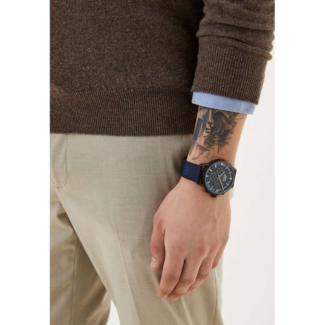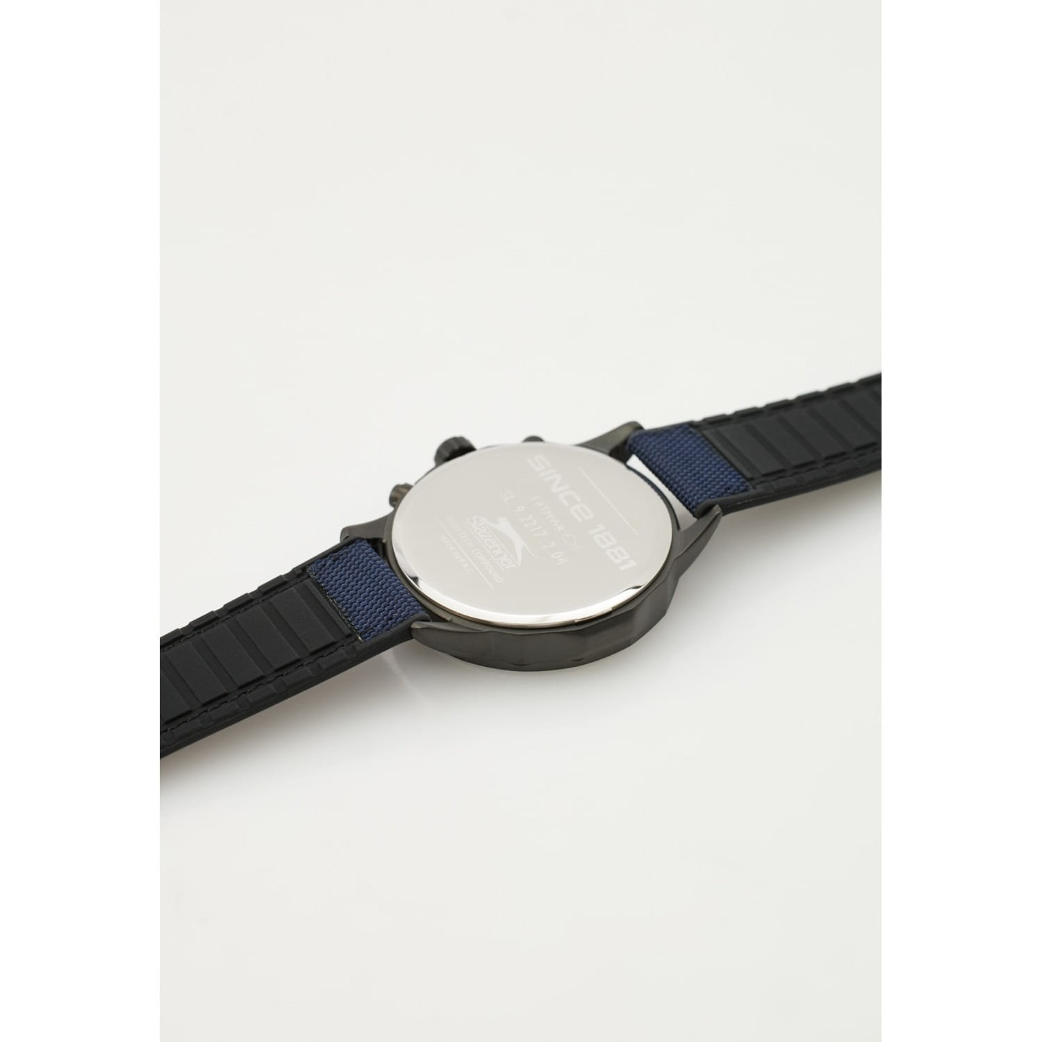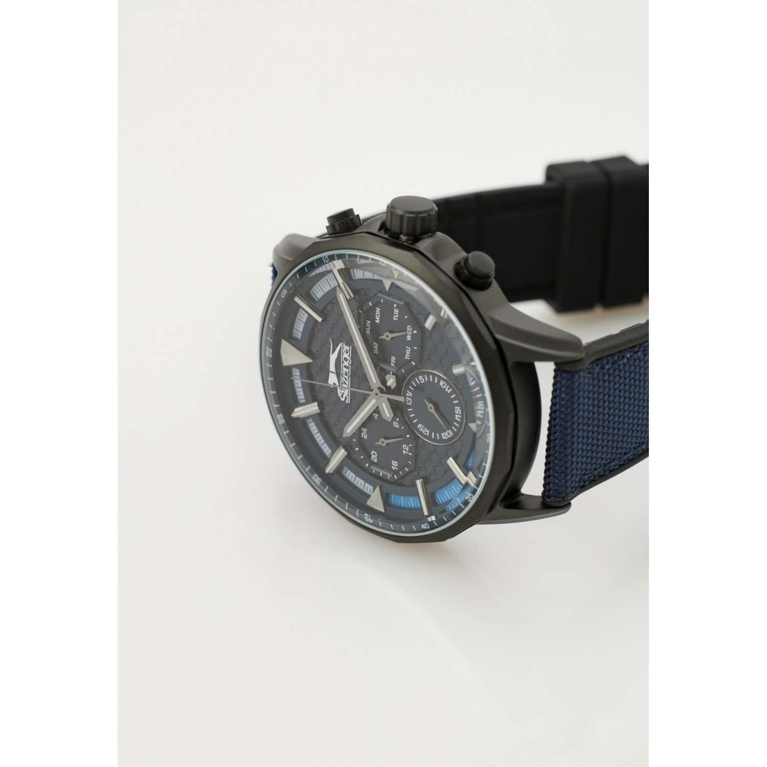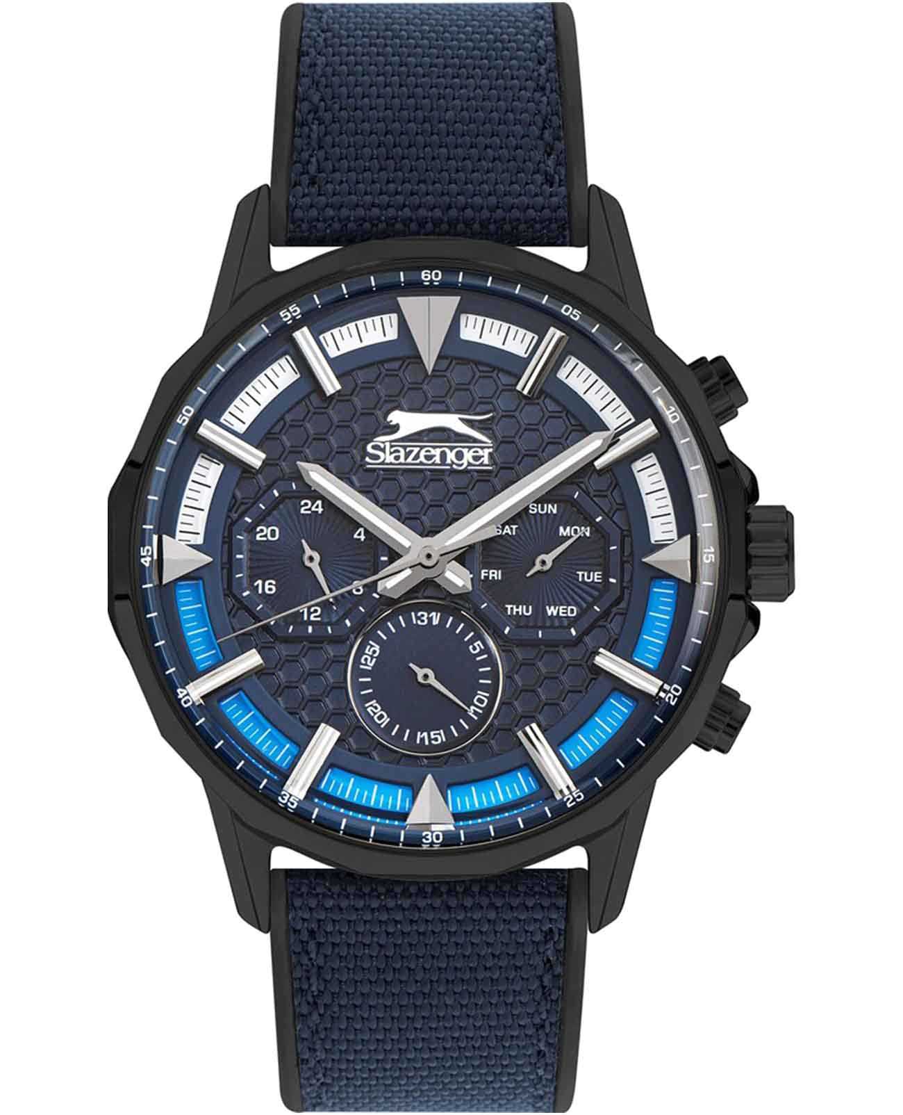 Стильные мужские наручные часы Slazenger SL.09.2217.2.04 станут идеальным аксессуаром для современного мужчины. Этот британский бренд славится своим качеством и надежностью, а данная модель не является исключением. Часы оснащены кварцевым механизмом, что обеспечивает точность хода и долговечность использования. Корпус часов выполнен из металла с черным IP-покрытиемIP-покрытиеМетод ионного напыления. Демонстрирует повышенную устойчивость к истиранию, окислению и химическим веществам. Под воздействием высокого давления и температуры около 1500°C молекулы металла надёжно соединяются с частицами корпуса часов., а прочное  минеральное стеклоМинеральное стеклоМинеральное стекло представляет собой искусственно выращенный минерал кварца. Такое стекло отличается особой устойчивостью к повреждениям и царапинам. Уступает по некоторым качествам сапфировому стеклу. защищает циферблат от царапин и повреждений. Элегантный синий тканевый ремешок на черном силиконовом основании с классической застежкой, что гарантирует комфортное ношение на запястье. Ширина браслета составляет 22 мм, что придает часам солидный вид. Диаметр корпуса равен 45 мм, а толщина 12 мм, что делает эту модель заметной, но в то же время не громоздкой. Водозащита уровня WR 50 позволяет использовать часы в повседневной жизни, не беспокоясь о случайных попаданиях воды. Стрелки снабжены люминесцентным покрытиемЛюминесцентное покрытиеПозволяет считывать показания времени в темноте. Производители наносят на стрелки, часовые индексы, безель или поверхность циферблата светонакопительный состав, дающий холодное свечение., что позволяет легко считывать время в темноте. Функциональные возможности часов включают отображение даты, дня недели и времени в 24-часовом формате на дополнительных малых циферблатах. Это делает модель не только стильной, но и практичной в использовании.