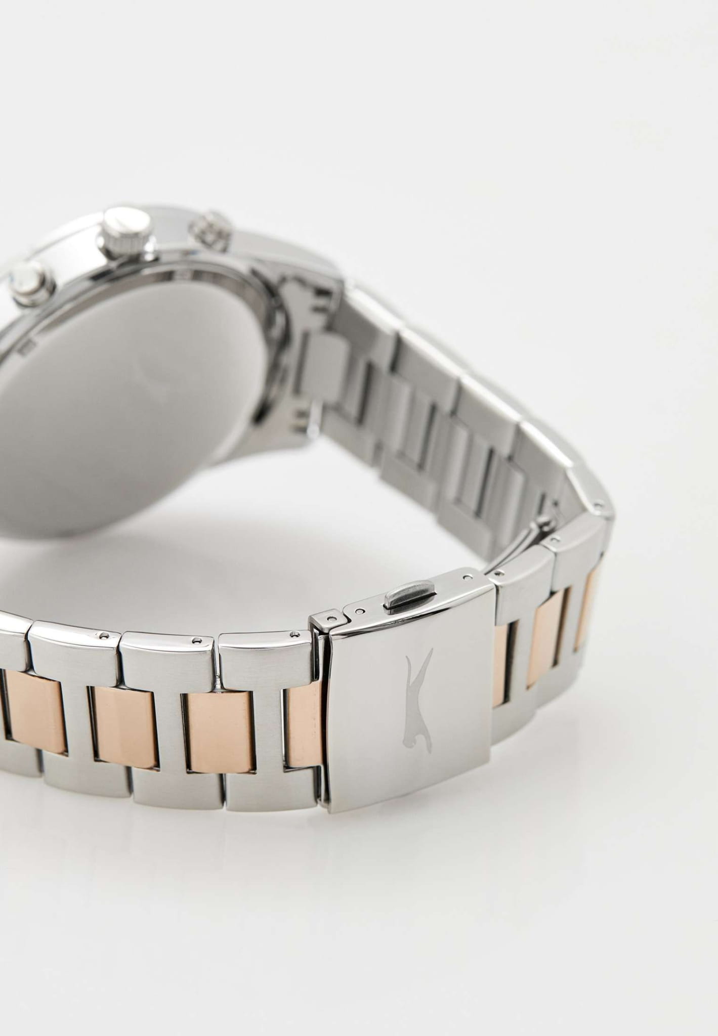 Часы Slazenger SL.09.2242.2.02 – это стильная и надежная модель, созданная для современных мужчин, ценящих качество и функциональность. Корпус и браслет выполнены из прочного металла серебряного цвета, что придает аксессуару элегантный внешний вид и обеспечивает долговечность. Часы фиксируются на руке с помощью браслета из металла с частичным золотистым IP-покрытиемIP-покрытиеМетод ионного напыления. Демонстрирует повышенную устойчивость к истиранию, окислению и химическим веществам. Под воздействием высокого давления и температуры около 1500°C молекулы металла надёжно соединяются с частицами корпуса часов. и удобной раскладной застёжкойРаскладная застёжкаТакой тип застёжки используется только на браслетах из металла. Она никогда не раскрывается полностью, происходит разделение на 2 и более частей. Раскладывающая застёжка снизит вероятность потери часов к минимуму.. Кварцевый механизм гарантирует точность хода, а минеральное стеклоМинеральное стеклоМинеральное стекло представляет собой искусственно выращенный минерал кварца. Такое стекло отличается особой устойчивостью к повреждениям и царапинам. Уступает по некоторым качествам сапфировому стеклу. защищает графитовый циферблат от царапин и повреждений. Диаметр корпуса составляет 46 мм, толщина – 13 мм, ширина ремешка – 24 мм, а вес часов – 146 грамм, что делает их удобными для повседневного ношения. Водозащита уровня WR 50 позволяет не снимать часы во время мытья рук и при незначительном контакте с водой. Для удобства использования в темное время суток предусмотрено люминесцентное покрытиеЛюминесцентное покрытиеПозволяет считывать показания времени в темноте. Производители наносят на стрелки, часовые индексы, безель или поверхность циферблата светонакопительный состав, дающий холодное свечение. стрелок. Модель оснащена дополнительными циферблатами, отображающими дату, день недели и текущее время в 24-часовом формате.