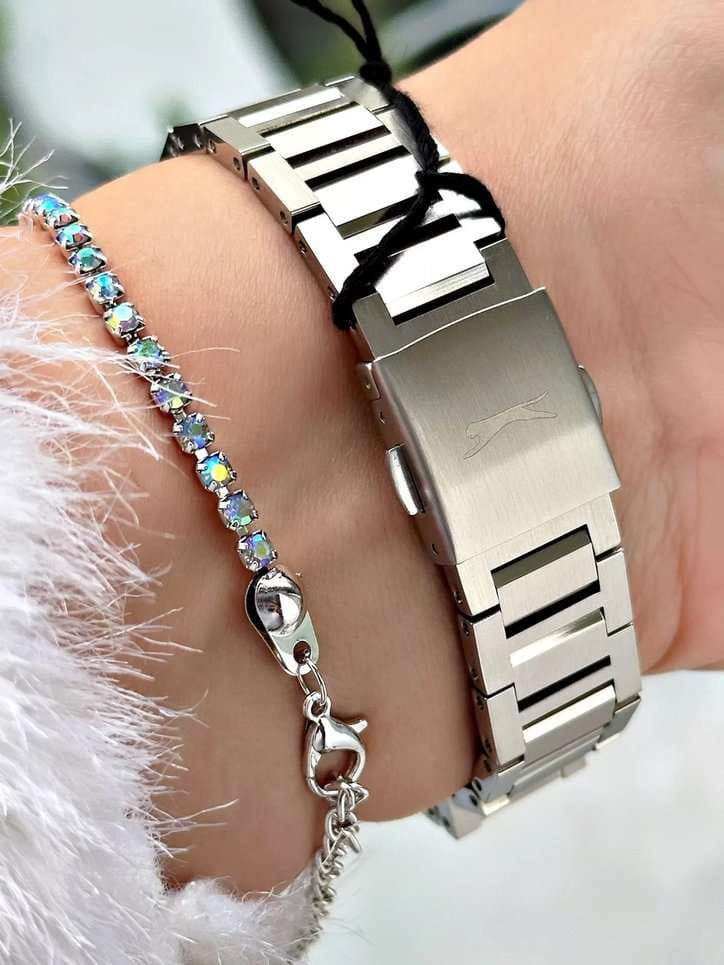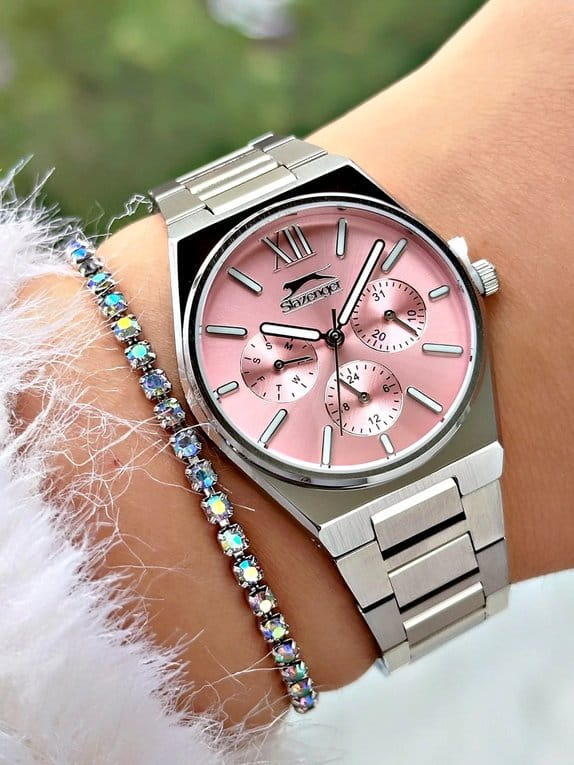 Часы Slazenger SL.09.2243.4.02 сочетают в себе элегантный дизайн и практичность для повседневного использования. Модель выполнена в изысканном серебряном цвете, корпус и браслет изготовлены из прочного металла, что обеспечивает надежность и долговечность изделия. Кварцевый механизм гарантирует точность хода, а минеральное стеклоМинеральное стеклоМинеральное стекло представляет собой искусственно выращенный минерал кварца. Такое стекло отличается особой устойчивостью к повреждениям и царапинам. Уступает по некоторым качествам сапфировому стеклу. защищает розовый циферблат от механических повреждений. Диаметр корпуса составляет 34 мм, толщина — 9 мм, ширина ремешка — 20 мм, а общий вес часов — всего 87 грамм, что делает их легкими и комфортными на руке. Уровень водозащиты WR 30 позволяет не беспокоиться о случайных брызгах. Для удобства использования в темное время суток предусмотрено люминесцентное покрытиеЛюминесцентное покрытиеПозволяет считывать показания времени в темноте. Производители наносят на стрелки, часовые индексы, безель или поверхность циферблата светонакопительный состав, дающий холодное свечение. стрелок и меток. Дополнительные малые циферблаты отображают дату, день недели и время в 24-часовом формате. Часы оснащены металлическим браслетом с надежной раскладной застёжкойРаскладная застёжкаТакой тип застёжки используется только на браслетах из металла. Она никогда не раскрывается полностью, происходит разделение на 2 и более частей. Раскладывающая застёжка снизит вероятность потери часов к минимуму..