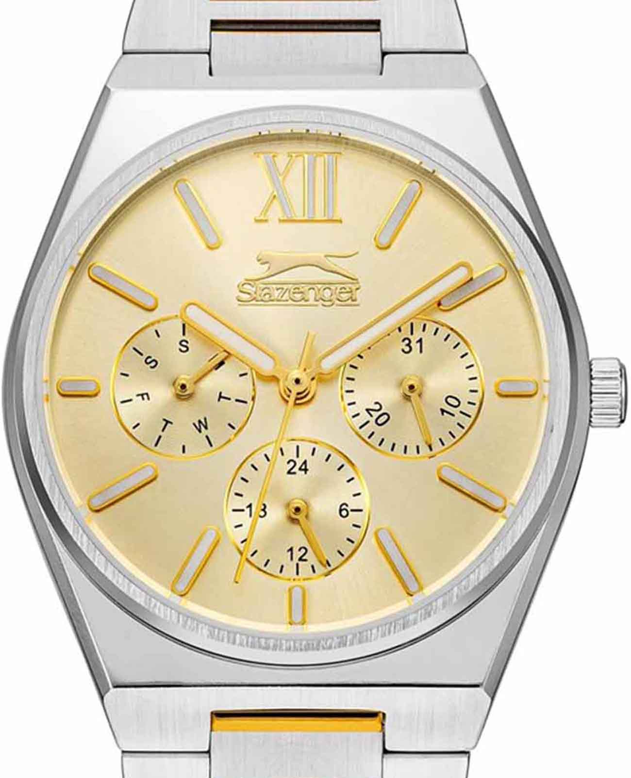 Часы Slazenger SL.09.2243.4.06 сочетают в себе элегантный дизайн и практичность для повседневного использования. Модель выполнена в изысканном серебряном цвете, корпус и браслет изготовлены из прочного металла, что обеспечивает надежность и долговечность изделия. А для придания уникальности на браслет нанесено частичное желтое IP-покрытиеIP-покрытиеМетод ионного напыления. Демонстрирует повышенную устойчивость к истиранию, окислению и химическим веществам. Под воздействием высокого давления и температуры около 1500°C молекулы металла надёжно соединяются с частицами корпуса часов.. Кварцевый механизм гарантирует точность хода, а минеральное стеклоМинеральное стеклоМинеральное стекло представляет собой искусственно выращенный минерал кварца. Такое стекло отличается особой устойчивостью к повреждениям и царапинам. Уступает по некоторым качествам сапфировому стеклу. защищает желтый циферблат от механических повреждений. Диаметр корпуса составляет 34 мм, толщина — 9 мм, ширина ремешка — 20 мм, а общий вес часов — всего 87 грамм, что делает их легкими и комфортными на руке. Уровень водозащиты WR 30 позволяет не беспокоиться о случайных брызгах. Для удобства использования в темное время суток предусмотрено люминесцентное покрытиеЛюминесцентное покрытиеПозволяет считывать показания времени в темноте. Производители наносят на стрелки, часовые индексы, безель или поверхность циферблата светонакопительный состав, дающий холодное свечение. стрелок и меток. Дополнительные малые циферблаты отображают дату, день недели и время в 24-часовом формате. Часы оснащены металлическим браслетом с надежной раскладной застёжкойРаскладная застёжкаТакой тип застёжки используется только на браслетах из металла. Она никогда не раскрывается полностью, происходит разделение на 2 и более частей. Раскладывающая застёжка снизит вероятность потери часов к минимуму..