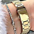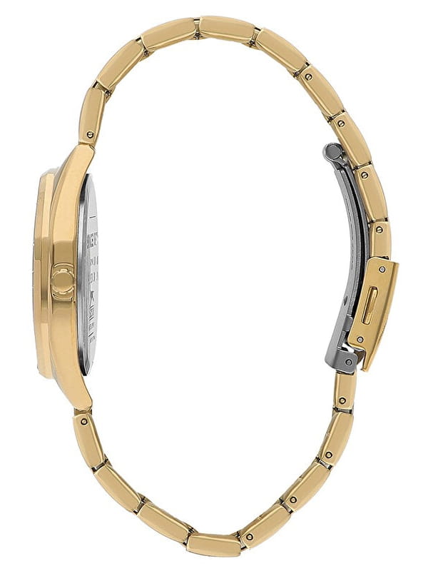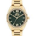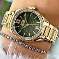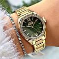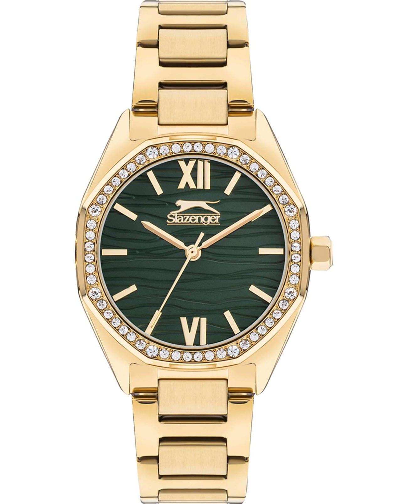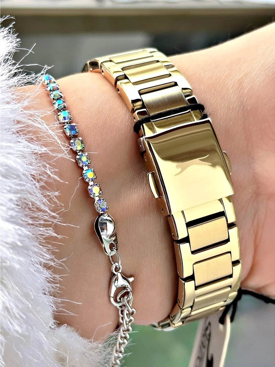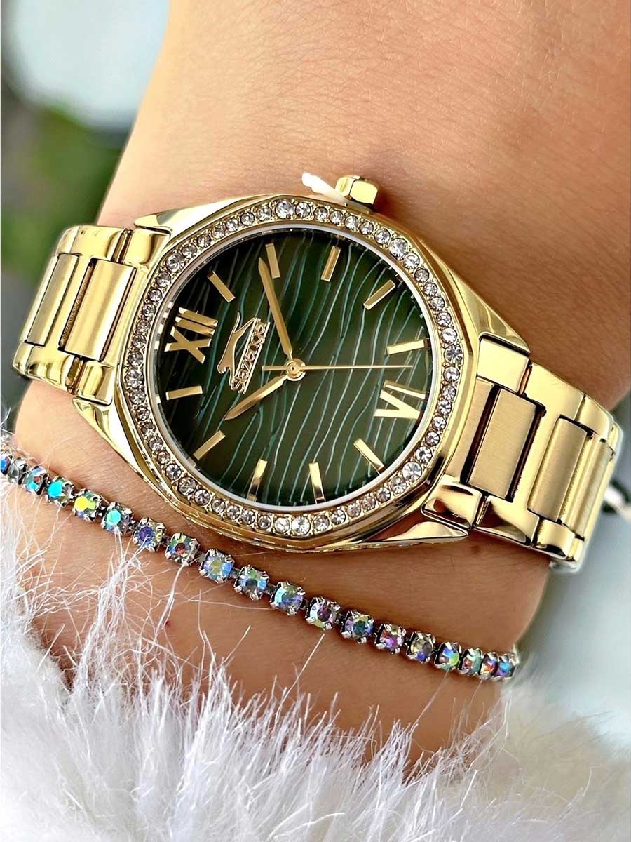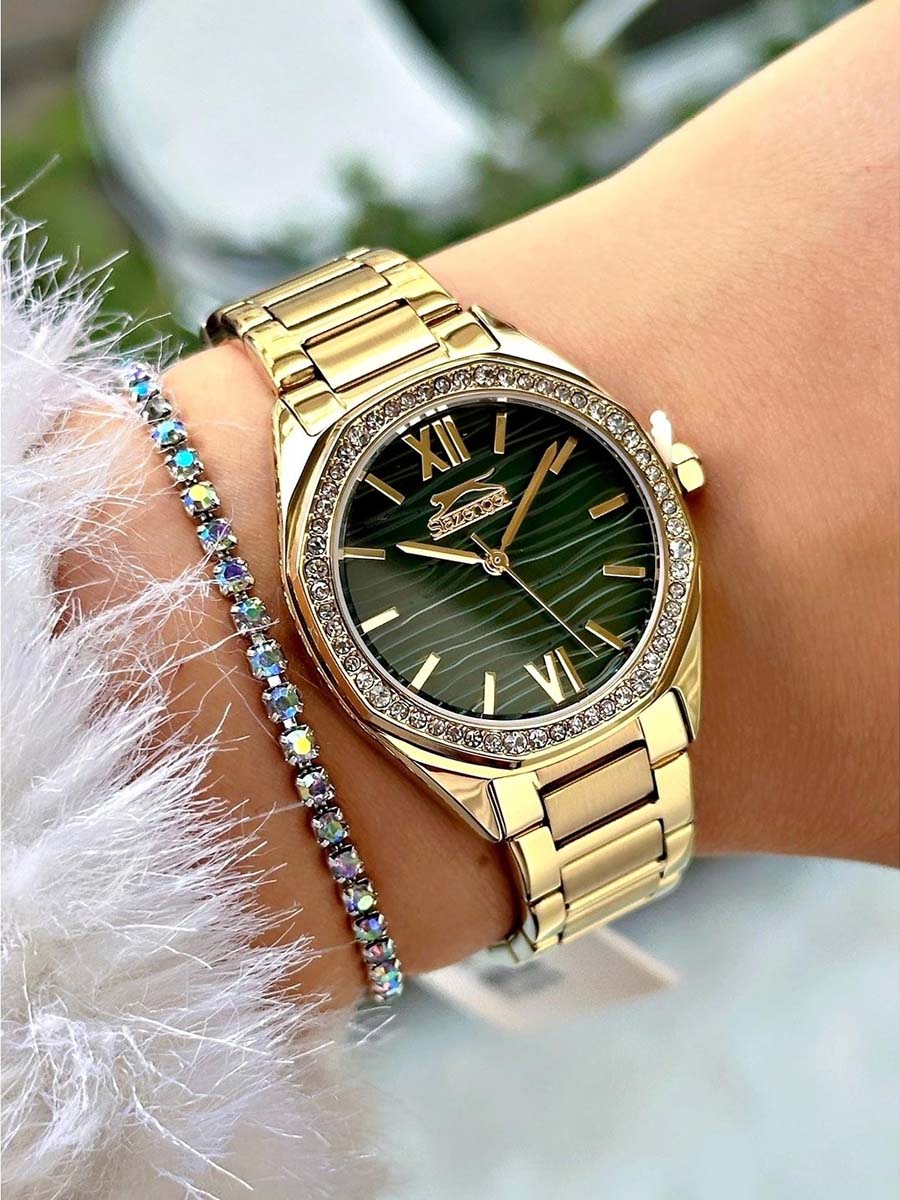 Женские кварцевые часы Slazenger SL.09.2301.3.03 — это элегантный и изысканный аксессуар, подчеркивающий стиль и утончённость. Корпус и браслет выполнены из суперметалла с IP-покрытиемIP-покрытиеМетод ионного напыления. Демонстрирует повышенную устойчивость к истиранию, окислению и химическим веществам. Под воздействием высокого давления и температуры около 1500°C молекулы металла надёжно соединяются с частицами корпуса часов., защищён минеральным стекломМинеральное стеклоМинеральное стекло представляет собой искусственно выращенный минерал кварца. Такое стекло отличается особой устойчивостью к повреждениям и царапинам. Уступает по некоторым качествам сапфировому стеклу.. Циферблат зелёного цвета с волнистым рельефным рисунком оформлен штриховыми метками и римскими цифрами VI и XII, дополнен логотипом бренда. Безель гранёный, украшен паве из фианитов, придающих модели изысканное сияние. Заводная головка — граненая, добавляющая детали дизайна. Браслет из суперметалла фиксируется на раскладной застёжкеРаскладная застёжкаТакой тип застёжки используется только на браслетах из металла. Она никогда не раскрывается полностью, происходит разделение на 2 и более частей. Раскладывающая застёжка снизит вероятность потери часов к минимуму., обеспечивая надёжность и комфорт ношения. Водонепроницаемость 30 м позволяет использовать часы в повседневных условиях, защищая от случайных брызг и капель дождя. Модель идеально подходит как для повседневного, так и для торжественного образа.
