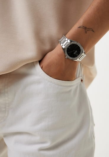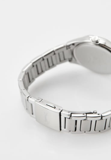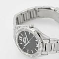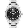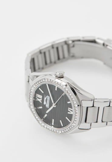 Женские кварцевые часы Slazenger SL.09.2301.3.04 — это элегантный и изысканный аксессуар, подчеркивающий стиль и утончённость. Корпус и браслет выполнены из суперметалла, защищён минеральным стекломМинеральное стеклоМинеральное стекло представляет собой искусственно выращенный минерал кварца. Такое стекло отличается особой устойчивостью к повреждениям и царапинам. Уступает по некоторым качествам сапфировому стеклу.. Циферблат чёрного цвета с рельефным рисунком оформлен штриховыми метками и римскими цифрами VI и XII, дополнен логотипом бренда. Безель гранёный, украшен паве из фианитов, придающих модели изысканное сияние. Заводная головка — граненая, добавляющая детали дизайна. Браслет из суперметалла фиксируется на раскладной застёжкеРаскладная застёжкаТакой тип застёжки используется только на браслетах из металла. Она никогда не раскрывается полностью, происходит разделение на 2 и более частей. Раскладывающая застёжка снизит вероятность потери часов к минимуму., обеспечивая надёжность и комфорт ношения. Водонепроницаемость 30 м позволяет использовать часы в повседневных условиях, защищая от случайных брызг и капель дождя. Модель идеально подходит как для повседневного, так и для торжественного образа.