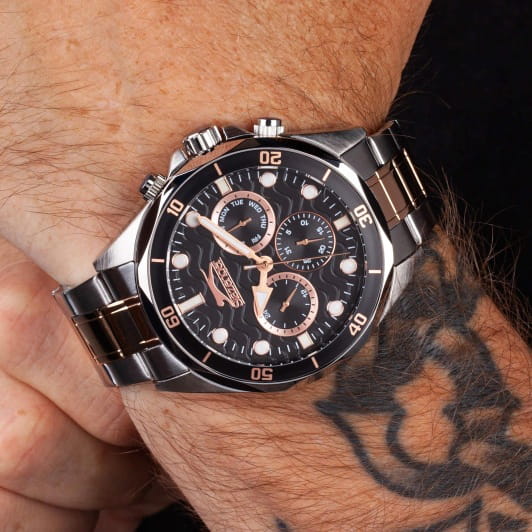 Мужские кварцевые часы Slazenger SL.09.2309.2.04 — это выразительный и функциональный аксессуар, сочетающий прочность, стиль и насыщенную комплектацию. Браслет выполнен из суперметалла с IP-покрытиемIP-покрытиеМетод ионного напыления. Демонстрирует повышенную устойчивость к истиранию, окислению и химическим веществам. Под воздействием высокого давления и температуры около 1500°C молекулы металла надёжно соединяются с частицами корпуса часов., защищён минеральным стекломМинеральное стеклоМинеральное стекло представляет собой искусственно выращенный минерал кварца. Такое стекло отличается особой устойчивостью к повреждениям и царапинам. Уступает по некоторым качествам сапфировому стеклу.. Циферблат чёрного цвета оформлен с вынесенными малыми циферблатами для индикации дня недели, даты и времени в 24-часовом формате. Стрелки и метки оснащены люминесцентным покрытиемЛюминесцентное покрытиеПозволяет считывать показания времени в темноте. Производители наносят на стрелки, часовые индексы, безель или поверхность циферблата светонакопительный состав, дающий холодное свечение., обеспечивающим хорошую читаемость в темноте. Заводная головка снабжена защитой, а задняя крышка — завинчивающаяся, что повышает надёжность конструкции. Браслет комбинированного цвета фиксируется на раскладной застёжкеРаскладная застёжкаТакой тип застёжки используется только на браслетах из металла. Она никогда не раскрывается полностью, происходит разделение на 2 и более частей. Раскладывающая застёжка снизит вероятность потери часов к минимуму., обеспечивая удобство и безопасность ношения. Водонепроницаемость 50 м позволяет использовать часы в повседневных условиях, защищая от случайных брызг и капель дождя. Модель подчёркивает индивидуальность владельца и идеально подходит как для повседневного, так и для делового образа.
