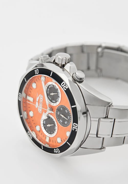 Мужские кварцевые часы Slazenger SL.09.2309.2.05 — это выразительный и функциональный аксессуар, сочетающий прочность, стиль и насыщенную комплектацию. Корпус и браслет выполнены из суперметалла, защищён минеральным стекломМинеральное стеклоМинеральное стекло представляет собой искусственно выращенный минерал кварца. Такое стекло отличается особой устойчивостью к повреждениям и царапинам. Уступает по некоторым качествам сапфировому стеклу.. Циферблат оранжевого цвета оформлен с вынесенными малыми циферблатами для индикации дня недели, даты и времени в 24-часовом формате. Стрелки и метки оснащены люминесцентным покрытиемЛюминесцентное покрытиеПозволяет считывать показания времени в темноте. Производители наносят на стрелки, часовые индексы, безель или поверхность циферблата светонакопительный состав, дающий холодное свечение., обеспечивающим хорошую читаемость в темноте. Заводная головка снабжена защитой, а задняя крышка — завинчивающаяся, что повышает надёжность конструкции. Браслет из суперметалла фиксируется на раскладной застёжкеРаскладная застёжкаТакой тип застёжки используется только на браслетах из металла. Она никогда не раскрывается полностью, происходит разделение на 2 и более частей. Раскладывающая застёжка снизит вероятность потери часов к минимуму., обеспечивая удобство и безопасность ношения. Водонепроницаемость 50 м позволяет использовать часы в повседневных условиях, защищая от случайных брызг и капель дождя. Модель подчёркивает индивидуальность владельца и идеально подходит как для повседневного, так и для делового образа.