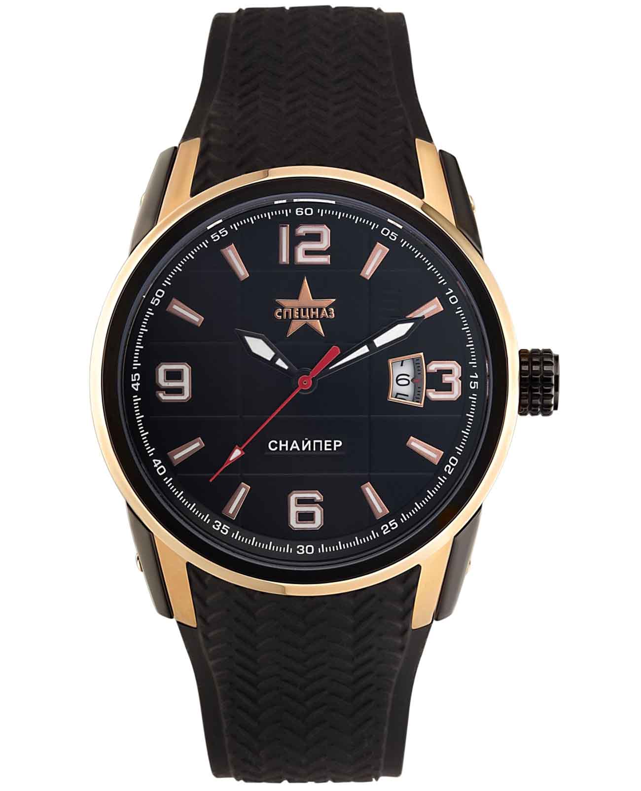 Часы Спецназ "Снайпер" С9482310-8215 — коллекционная модель, сочетающая функциональность и стильный дизайн. Корпус диаметром 47 мм выполнен из нержавеющей стали с комбинированным PVDPVDУльтратонкое покрытие наносится в технике вакуумного напыления, сочетает в себе нитрид титана особой прочности со слоем золота или оксида хрома. Несёт в себе декоративную или защитную функцию. покрытием, а чёрный циферблат защищён сапфировым стекломСапфировое стеклоПрочный и надёжный материал из кристалла сапфира синтетического происхождения, характеризующийся особой твёрдостью и устойчивостью к царапинам и повреждениям. с антибликовым покрытием. Внутри установлен японский кварцевый механизм Miyota 8215, обеспечивающий высокую точность хода. Люминесцентное покрытиеЛюминесцентное покрытиеПозволяет считывать показания времени в темноте. Производители наносят на стрелки, часовые индексы, безель или поверхность циферблата светонакопительный состав, дающий холодное свечение. на стрелках обеспечивает отличную видимость в темноте. Водозащита 100 метров (10 ATM) позволяет использовать часы для плавания и других водных видов спорта. Полимерный ремешок с застёжкой бабочкаЗастёжка "бабочка"Такой вид застёжки дополняется предохранителями, помогающими избежать случайного раскрытия браслета. Обладают изящным исполнением. обеспечивает комфортное ношение и надёжную фиксацию на запястье. Эта модель выпущена ограниченной серией и подойдёт для тех, кто ценит сочетание надёжности, функциональности и современного дизайна.
