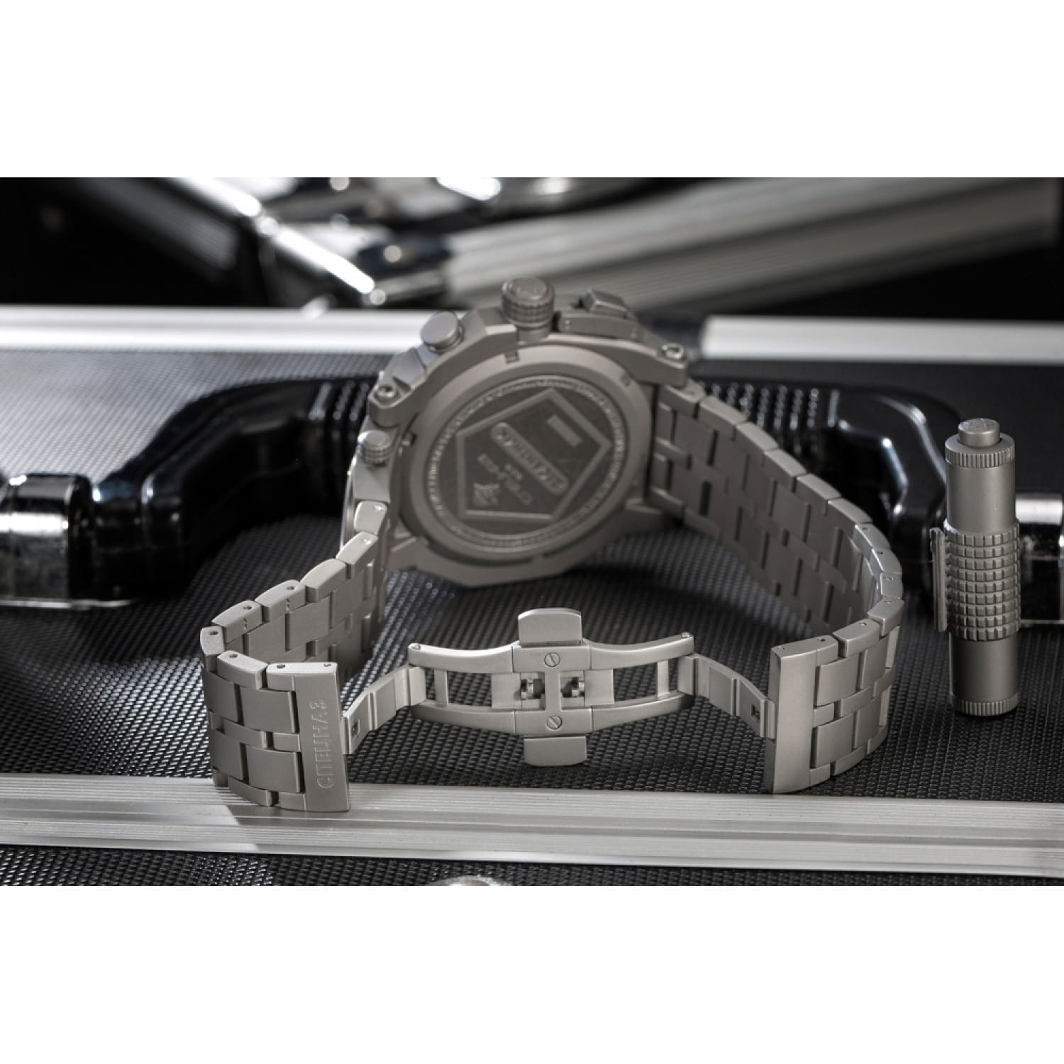 Водозащита 100 метров (10 ATM) позволяет использовать часы для плавания и других водных видов спорта. Титановый браслет с застёжкой раскладной застёжкойРаскладная застёжкаТакой тип застёжки используется только на браслетах из металла. Она никогда не раскрывается полностью, происходит разделение на 2 и более частей. Раскладывающая застёжка снизит вероятность потери часов к минимуму. и системой блокировки обеспечивает комфортное ношение и надёжную фиксацию на запястье.