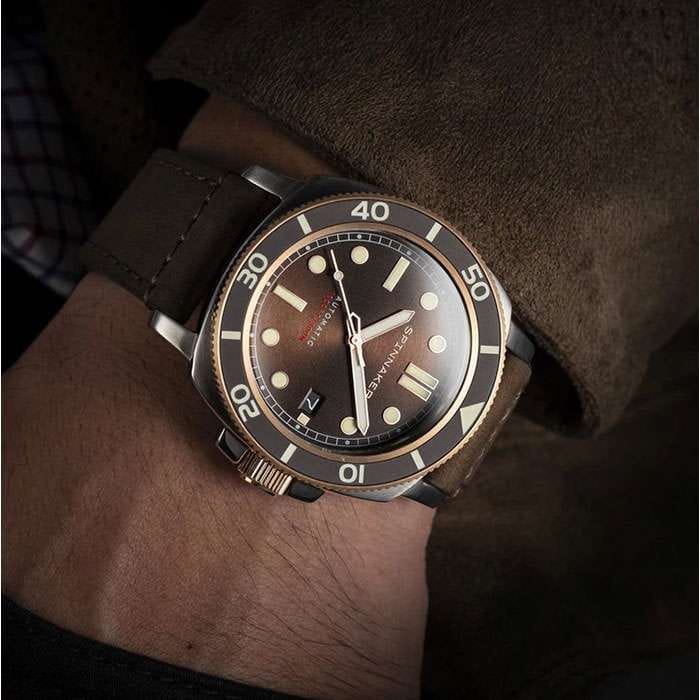 Мужские механические часы с автоподзаводом Spinnaker — это стильный и надёжный аксессуар. Корпус диаметром 42 мм и толщиной 14 мм выполнен из нержавеющей стали 316L. Циферблат коричневого цвета оформлен индексами и стрелками. Стрелки и метки с люминесцентным покрытиемЛюминесцентное покрытиеПозволяет считывать показания времени в темноте. Производители наносят на стрелки, часовые индексы, безель или поверхность циферблата светонакопительный состав, дающий холодное свечение., обеспечивающим хорошую читаемость в темноте. Окошко даты расположено в положении 3 часов. Циферблат защищён сапфировым стекломСапфировое стеклоПрочный и надёжный материал из кристалла сапфира синтетического происхождения, характеризующийся особой твёрдостью и устойчивостью к царапинам и повреждениям.. Механизм — автоматический калибр NH35 (24 камня, частота 21 600 полуколебаний в час) с запасом хода до 40 часов. Однонаправленный безельБезельВнешний ободок, закрепляющий стекло. В спортивных часах так называется поворотное кольцо с делениями на циферблате, выполняет роль таймера – замеряет отрезки времени на шкале. Неподвижный безель – элемент декора. Однонаправленно вращающийся безель на дайверских часах позволяет фиксировать моменты погружения и выныривания на поверхность. с PVD-покрытиемPVDУльтратонкое покрытие наносится в технике вакуумного напыления, сочетает в себе нитрид титана особой прочности со слоем золота или оксида хрома. Несёт в себе декоративную или защитную функцию. обеспечивает точный контроль времени погружения. Часы оснащены коричневым кожаным ремешком шириной 22 мм на классической пряжке. Водонепроницаемость 300 м позволяет использовать часы для плавания и дайвинга. Идеальный выбор для тех, кто ценит качество и универсальный дизайн.