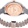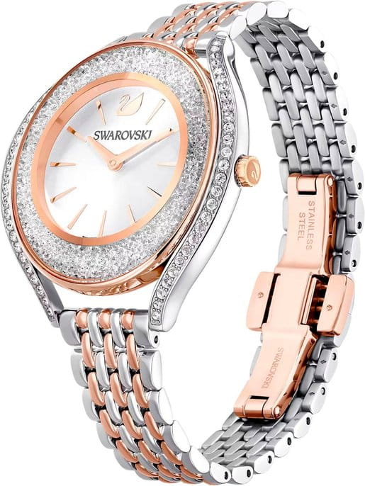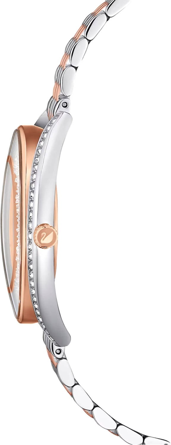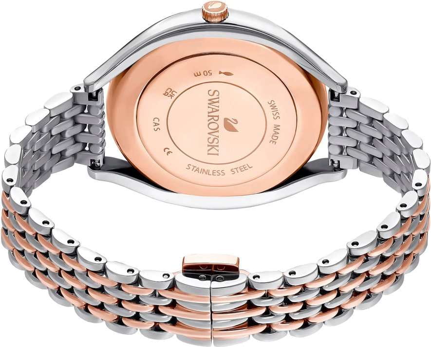 Swarovski 5644075 — элегантные женские часы из коллекции Crystalline Aura, сочетающие изысканный дизайн с высоким качеством. Корпус диаметром 35,5 мм выполнен из нержавеющей стали с розовым PVD-покрытиемPVDУльтратонкое покрытие наносится в технике вакуумного напыления, сочетает в себе нитрид титана особой прочности со слоем золота или оксида хрома. Несёт в себе декоративную или защитную функцию., что обеспечивает долговечность и элегантный внешний вид. Минеральное стеклоМинеральное стеклоМинеральное стекло представляет собой искусственно выращенный минерал кварца. Такое стекло отличается особой устойчивостью к повреждениям и царапинам. Уступает по некоторым качествам сапфировому стеклу. защищает циферблат от царапин. Корпус украшен более чем 1300 кристаллами Swarovski, создающими роскошный блеск. Серебристый циферблат с изящными розово-золотистыми метками и стрелками подчёркивает утончённость дизайна. Логотип Swarovski в виде лебедя расположен на отметке «12 часов». Часы оснащены швейцарским кварцевым механизмом, обеспечивающим точный ход. Браслет из нержавеющей стали с розовым частичным PVD-покрытиемPVDУльтратонкое покрытие наносится в технике вакуумного напыления, сочетает в себе нитрид титана особой прочности со слоем золота или оксида хрома. Несёт в себе декоративную или защитную функцию. гарантирует комфортное ношение. Застёжка-бабочкаЗастёжка "бабочка"Такой вид застёжки дополняется предохранителями, помогающими избежать случайного раскрытия браслета. Обладают изящным исполнением. обеспечивает надёжную фиксацию. Водозащита до 5 ATM (50 метров) делает часы подходящими для повседневного использования. Swarovski 5644075 — это идеальный выбор для женщин, ценящих утончённый стиль и функциональность.