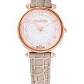 Часы Swarovski 5656899 представляют собой идеальное сочетание роскоши и изысканности, которые подчеркнут вашу индивидуальность и стиль. Эти швейцарские часы оснащены надежным кварцевым механизмом, гарантирующим точность времени. Круглый корпус из нержавеющей стали с PVDPVDУльтратонкое покрытие наносится в технике вакуумного напыления, сочетает в себе нитрид титана особой прочности со слоем золота или оксида хрома. Несёт в себе декоративную или защитную функцию. покрытием оттенка розового золота создает элегантный и утонченный образ. Под куполообразным минеральным стекломМинеральное стеклоМинеральное стекло представляет собой искусственно выращенный минерал кварца. Такое стекло отличается особой устойчивостью к повреждениям и царапинам. Уступает по некоторым качествам сапфировому стеклу. расположен серебристый циферблат, декорированный примерно тысячью сверкающих кристаллов Swarovski. Метки в виде штрихов и арабских цифр добавляют классический акцент, а граненая заводная головка украшена кристаллом круглой огранки. Ремешок из натуральной итальянской телячьей кожи серого цвета, с тиснением под кожу ящерицы, обеспечивает комфорт и стиль, а стандартная застежка гарантирует надежную фиксацию на запястье. Водозащита 50WR позволяет носить часы в различных условиях, защищая их от воздействия влаги. С диаметром корпуса 35 мм и длиной ремешка 16,5 см, эти часы идеально подходят для любого случая, создавая выразительный и эффектный образ.