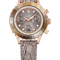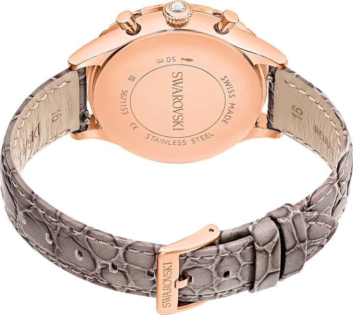 Часы Swarovski 5671153 представляют собой изысканное сочетание стиля и функциональности, идеально подходящее для ценителей элегантных аксессуаров. Эти швейцарские кварцевые часы с хронографомХронографФункция позволяет измерять отрезки времени с особой точностью: часы, минуты, секунды. Верным признаком хронографа является наличие на циферблате 3 дополнительных окошек-счётчиков. и  секундомеромСекундомерСекундоме́р — прибор, способный измерять интервалы времени с точностью до долей секунды. заключены в корпус из стали с розовым PVDPVDУльтратонкое покрытие наносится в технике вакуумного напыления, сочетает в себе нитрид титана особой прочности со слоем золота или оксида хрома. Несёт в себе декоративную или защитную функцию. покрытием, который дополнен коричневым циферблатом. Особое внимание привлекает инкрустация кристаллами Swarovski, украшающими корпус и циферблат, создавая эффектный блеск и подчеркивая роскошь изделия. Минеральное стеклоМинеральное стеклоМинеральное стекло представляет собой искусственно выращенный минерал кварца. Такое стекло отличается особой устойчивостью к повреждениям и царапинам. Уступает по некоторым качествам сапфировому стеклу. надежно защищает циферблат, а водозащита 50 WR позволяет не беспокоиться о контакте с водой в повседневных ситуациях. Эти часы не только точные и надежные, благодаря кварцевому механизму, но и невероятно стильные, благодаря кристальному безелюБезельВнешний ободок, закрепляющий стекло. В спортивных часах так называется поворотное кольцо с делениями на циферблате, выполняет роль таймера – замеряет отрезки времени на шкале. Неподвижный безель – элемент декора. Однонаправленно вращающийся безель на дайверских часах позволяет фиксировать моменты погружения и выныривания на поверхность. и коричневому ремешку из натуральной итальянской телячьей кожи с тиснением под крокодила, что обеспечивает комфортное ношение и стильный внешний вид. Заводная головка дополнительно украшена кристаллом круглой огранки, придающим часам завершенность и изящество. Люминесцентное покрытиеЛюминесцентное покрытиеПозволяет считывать показания времени в темноте. Производители наносят на стрелки, часовые индексы, безель или поверхность циферблата светонакопительный состав, дающий холодное свечение. на стрелках обеспечивает отличную видимость в темноте. Эти часы не просто аксессуар, а настоящее произведение искусства, способное стать ярким акцентом любого образа.
