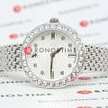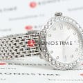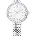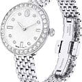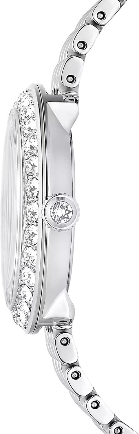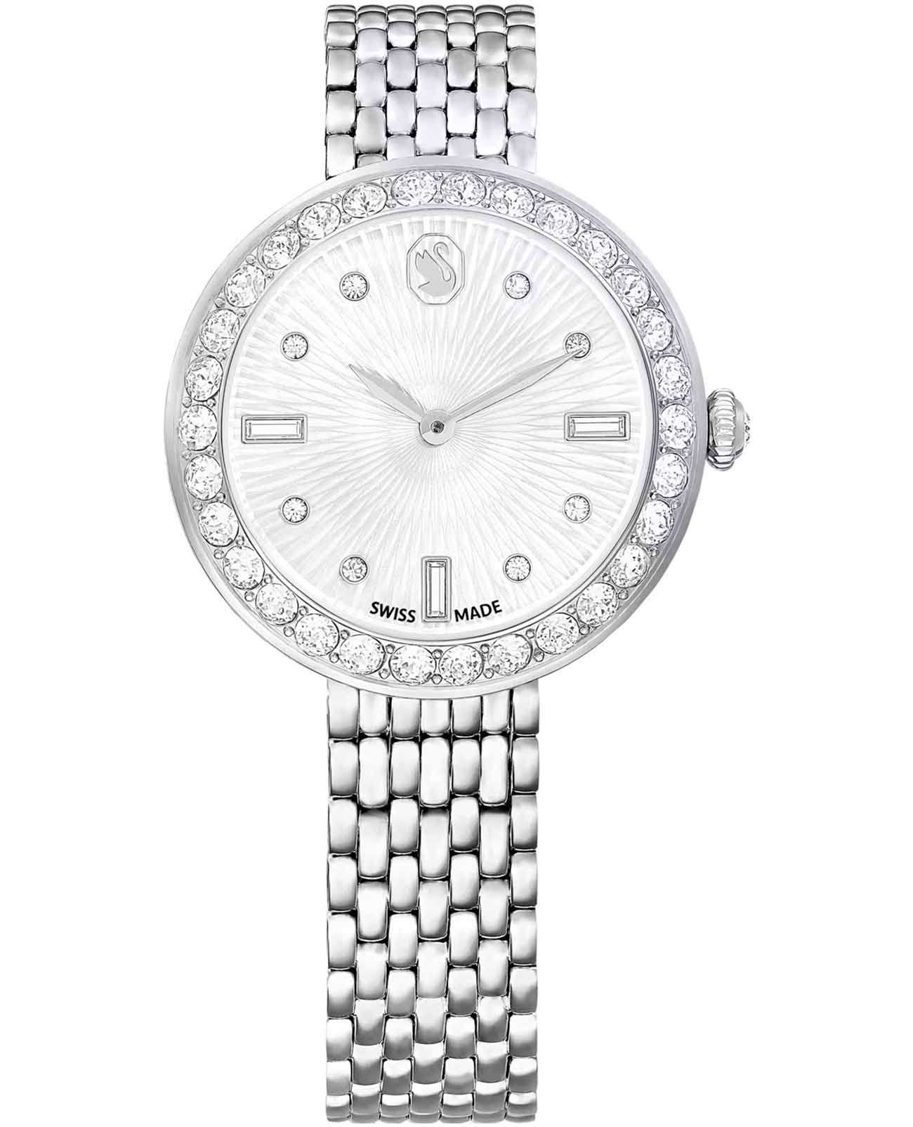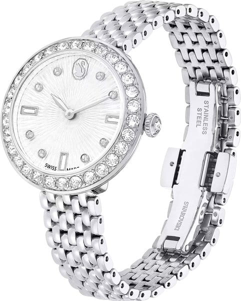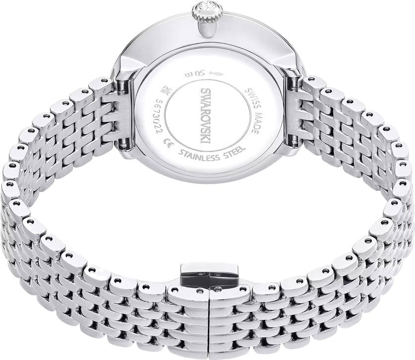Часы Swarovski 5673022 – это воплощение изысканного дизайна и функциональности, созданное для тех, кто ценит красоту и точность. Серебристый круглый корпус из нержавеющей стали оснащен безелемБезельВнешний ободок, закрепляющий стекло. В спортивных часах так называется поворотное кольцо с делениями на циферблате, выполняет роль таймера – замеряет отрезки времени на шкале. Неподвижный безель – элемент декора. Однонаправленно вращающийся безель на дайверских часах позволяет фиксировать моменты погружения и выныривания на поверхность., украшенным паве из тридцати мерцающих кристаллов. Под минеральным стекломМинеральное стеклоМинеральное стекло представляет собой искусственно выращенный минерал кварца. Такое стекло отличается особой устойчивостью к повреждениям и царапинам. Уступает по некоторым качествам сапфировому стеклу. открывается завораживающий гильошированный циферблат с логотипом Swarovski в виде лебедя в положении 12 часов и метками, выполненными из круглых и багетных кристаллов в положениях 3,6 и 9 часов. Отсутствие секундной стрелки подчеркивает минимализм и утонченность дизайна. Рифленая заводная головка также украшена сверкающим кристаллом круглой огранки. Серебристый браслет из нержавеющей стали с застежкой «бабочка»Застёжка "бабочка"Такой вид застёжки дополняется предохранителями, помогающими избежать случайного раскрытия браслета. Обладают изящным исполнением. . Водозащита 50WR делает их устойчивыми к влаге, позволяя наслаждаться стильным аксессуаром в любых условиях.