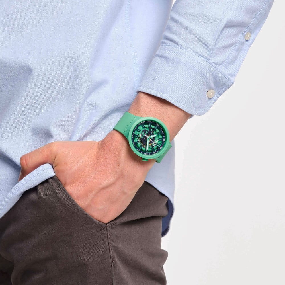 Часы Swatch SB01G101 — это стильный и современный аксессуар для тех, кто ценит лёгкость и комфорт. Часы идеально подойдут как для мужчин, так и для женщин. Корпус этих крупных часов выполнен из прочного матового пластика зеленого цвета, а ремешок — из силикона. На часовую, минутную стрелки нанесено люминесцентное покрытиеЛюминесцентное покрытиеПозволяет считывать показания времени в темноте. Производители наносят на стрелки, часовые индексы, безель или поверхность циферблата светонакопительный состав, дающий холодное свечение., которое светится в темноте, создавая необычное изображение. Водозащита 30 метров делает часы практичными для повседневного использования. Эти часы подойдут для повседневного ношения и станут ярким акцентом в вашем наряде.