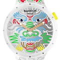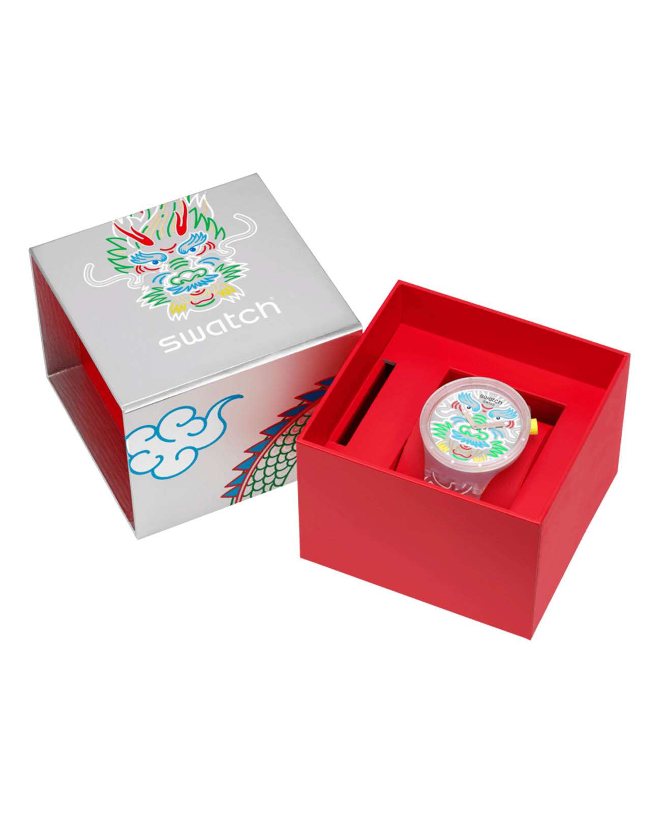 Часы Swatch SB05Z102 — это стильный и современный аксессуар для тех, кто ценит лёгкость и комфорт. Часы идеально подойдут как для мужчин, так и для женщин. Полупрозрачный корпус и стекло этих крупных часов изготовлены из биоматериала, а серебристый циферблат украшен цветным изображением дракона. Модель оснащена полупрозрачным матово-белым ремешком с красочным принтом, серебристой пряжкой и двумя тренчиками: белым с серебряной надписью и серебристым с красной. На часовую и минутную стрелки нанесено люминесцентное покрытиеЛюминесцентное покрытиеПозволяет считывать показания времени в темноте. Производители наносят на стрелки, часовые индексы, безель или поверхность циферблата светонакопительный состав, дающий холодное свечение., которое светится в темноте, создавая необычное изображение. Водозащита 30 метров делает часы практичными для повседневного использования. Эти часы подойдут для повседневного ношения и станут ярким акцентом в вашем наряде.