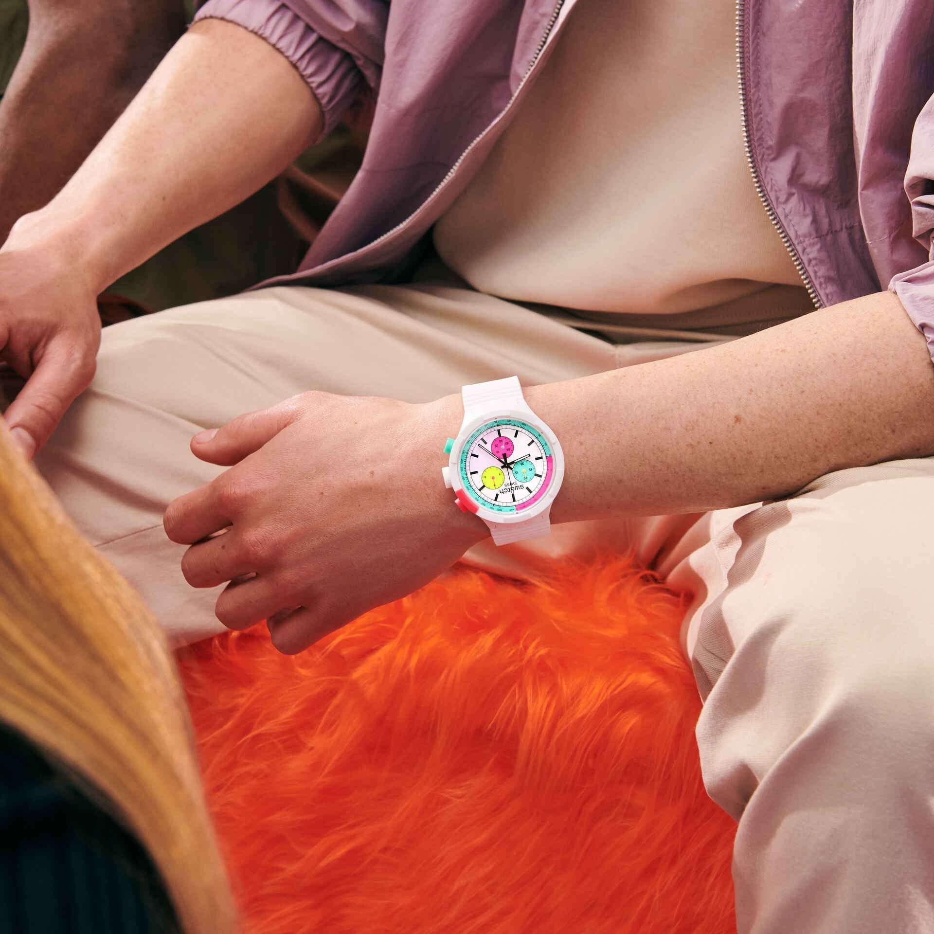 Часы Swatch SB06W100 — это стильный и современный аксессуар для тех, кто ценит лёгкость и комфорт. Часы идеально подойдут как для мужчин, так и для женщин.Эти ретро-часы с массивным циферблатом напоминают WHITE HORSES CHRONO SCW100, хронометр Swatch из 90-х. Часы с характерным дизайном и яркой кнопкой хронографаХронографФункция позволяет измерять отрезки времени с особой точностью: часы, минуты, секунды. Верным признаком хронографа является наличие на циферблате 3 дополнительных окошек-счётчиков. на двух часах – это идеальные часы, чтобы достичь неожиданных побед. На их необычайно красочном неоновом циферблате с белым корпусом шкала тахиметраТахиметрРазмеченная шкала, располагается на ободке или безеле часов. Тахиметр позволяет рассчитать скорость на определённом участке пути, расстояние измеряется в километрах или милях.. На часовую, минутную стрелки нанесено люминесцентное покрытиеЛюминесцентное покрытиеПозволяет считывать показания времени в темноте. Производители наносят на стрелки, часовые индексы, безель или поверхность циферблата светонакопительный состав, дающий холодное свечение., которое светится в темноте, создавая необычное изображение. Модель дополнена белым ремешком из биоматериала. Водозащита 30 метров делает часы практичными для повседневного использования. Эти часы подойдут для повседневного ношения и станут ярким акцентом в вашем наряде.