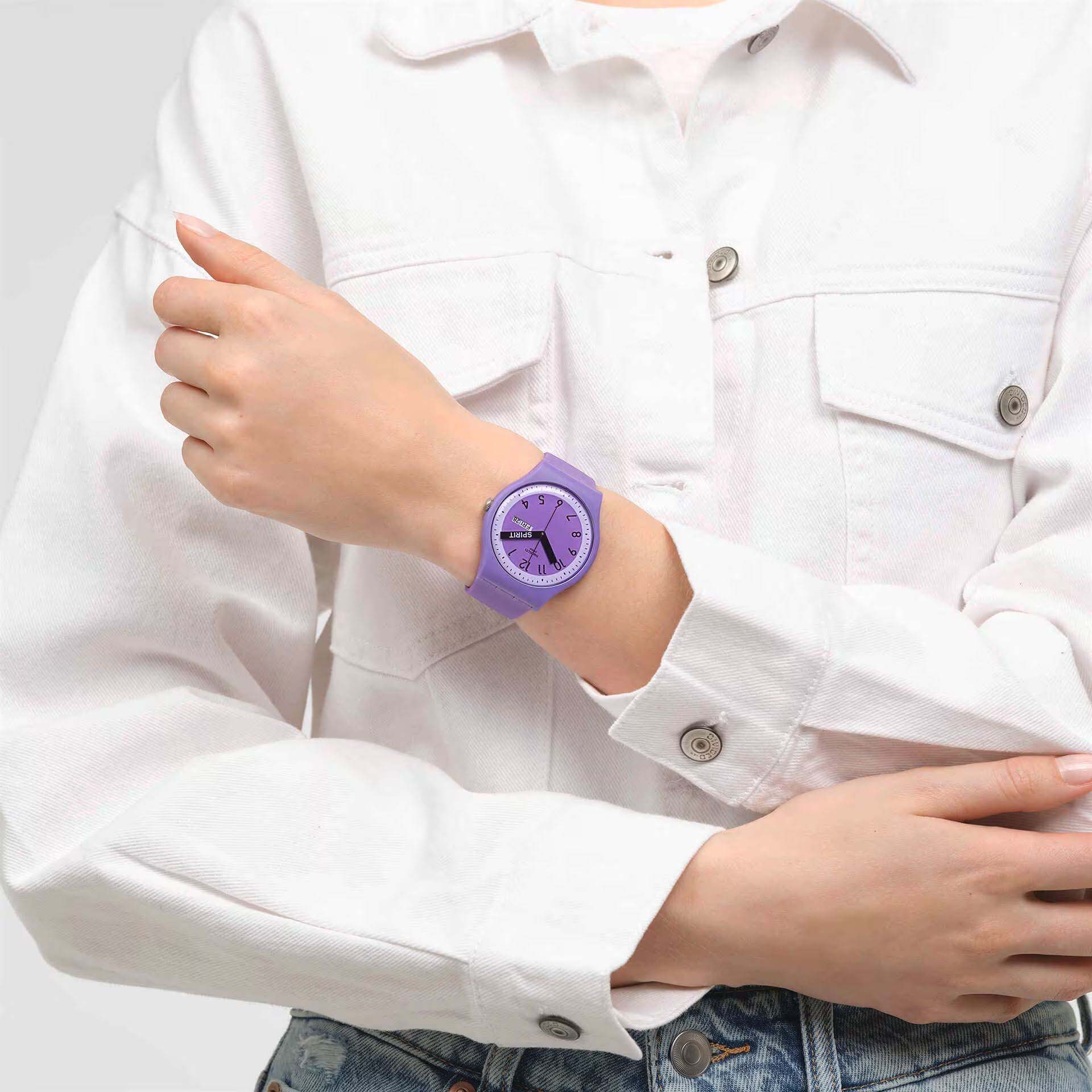 Часы Swatch SO29V700 — стильный и надежный аксессуар. Эти часы Swatch Pride 2023 Special имеют фиолетовый циферблат и фиолетовое стекло из биоматериала в корпусе из тех же материалов. Часовая и минутная стрелки черные, при этом минутная стрелка символизирует значение фиолетового цвета в флаге Прайда: дух. Соответствующий ремешок этих фиолетовых часов включает две петли, которые, соединяясь, образуют радугу. Окошко даты и дня недели расположены на 3 часа. Ремешок силиконовый на классической застежке. Внутри часов установлен надежный кварцевый механизм, который обеспечивает точность хода. Эти часы водонепроницаемы до 30 метров, что позволяет не беспокоиться о случайных брызгах или дождевых каплях. Swatch SSO29V700 — это идеальный выбор для тех, кто ценит сочетание стиля, комфорта и функциональности в одном аксессуаре.