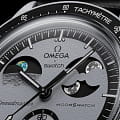 Часы Swatch Bioceramic Moonswatch MISSION TO EARTHPHASE SO33M700 — это стильный и современный аксессуар для тех, кто ценит лёгкость и комфорт. Часы идеально подойдут как для мужчин, так и для женщин. Корпус диаметром 42 мм и пряжка этих уникальных часов изготовлены из биокерамикиБиокерамикаБиокерамика — это материал, который на две трети состоит из керамики, на одну треть — из биопластика. Он сочетает в себе лучшие качества обоих материалов и обладает прочностью и шелковистой на ощупь текстурой. серой расцветки, напоминающей нержавеющую сталь. Модель оснащена серым циферблатом и черным биокерамическим безелемБезельВнешний ободок, закрепляющий стекло. В спортивных часах так называется поворотное кольцо с делениями на циферблате, выполняет роль таймера – замеряет отрезки времени на шкале. Неподвижный безель – элемент декора. Однонаправленно вращающийся безель на дайверских часах позволяет фиксировать моменты погружения и выныривания на поверхность. с нанесенной на него шкалой тахиметраТахиметрРазмеченная шкала, располагается на ободке или безеле часов. Тахиметр позволяет рассчитать скорость на определённом участке пути, расстояние измеряется в километрах или милях., а также черным ремешком с липучкой VELCRO®. Часовые отметки, часовая и минутная стрелки, а также кончик секундной стрелки хронографаХронографФункция позволяет измерять отрезки времени с особой точностью: часы, минуты, секунды. Верным признаком хронографа является наличие на циферблате 3 дополнительных окошек-счётчиков. покрыты люминесцентным покрытиемЛюминесцентное покрытиеПозволяет считывать показания времени в темноте. Производители наносят на стрелки, часовые индексы, безель или поверхность циферблата светонакопительный состав, дающий холодное свечение. Super-LumiNova® класса А, благодаря чему они прекрасно светятся в темноте (зеленым свечением). В честь Луны и Земли они оснащены индикатором лунных фаз и запатентованным указателем земных фаз. На диске индикатора фаз Луны, вращающемся на дополнительном циферблате в районе отметки 2 часа, размещены две крупные Луны с покрытием Super-LumiNova® (с белым свечением).