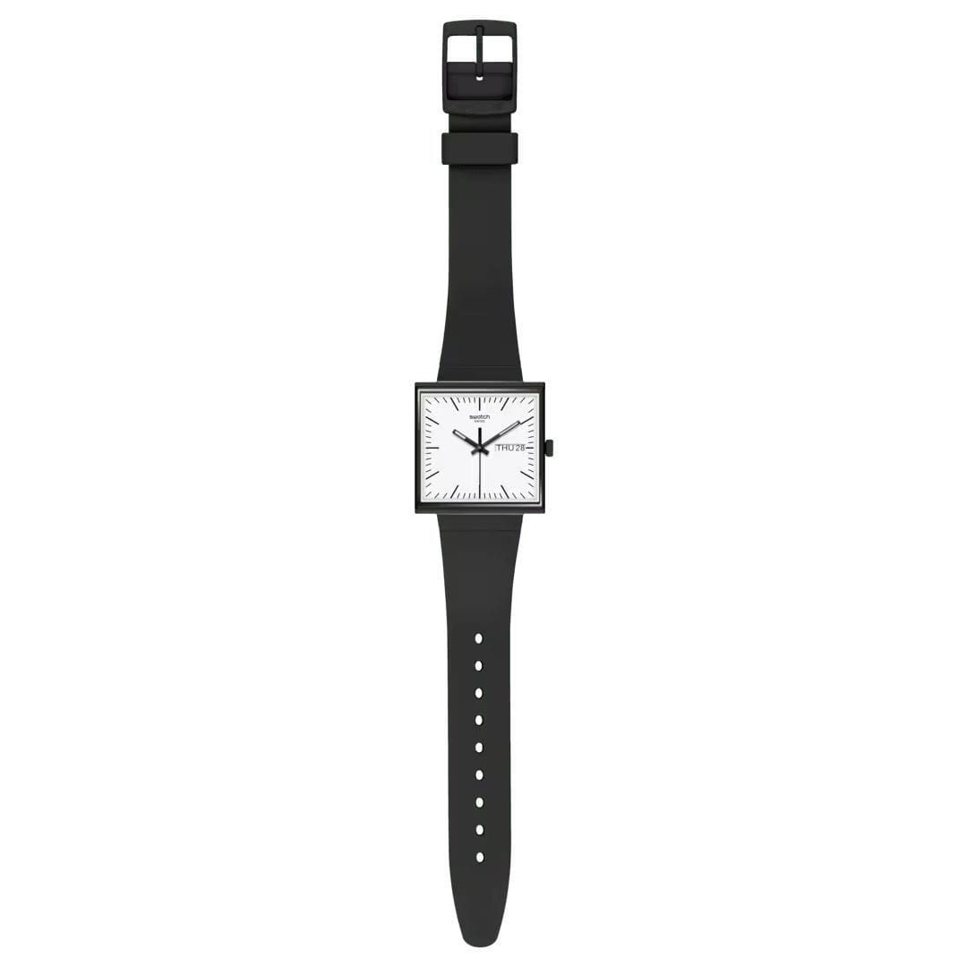 Swatch New Square Bioceramic Standard SO34B700 "WHAT IF...BLACK?" - это стильные квадратные часы с корпусом 33x33 мм из черной матовой биокерамики и белым циферблатом. Модель оснащена кварцевым механизмом, окошком даты и дня недели, водонепроницаемостью до 20 метров. Стрелки с люминесцентным покрытиемЛюминесцентное покрытиеПозволяет считывать показания времени в темноте. Производители наносят на стрелки, часовые индексы, безель или поверхность циферблата светонакопительный состав, дающий холодное свечение.. Часы имеют черный матовый ремешок из биоматериала и стекло из биоматериала. Эта экологичная модель унисекс сочетает инновационные материалы с классическим черно-белым дизайном, вдохновленным оригинальным Swatch 1983 года, и подходит для тех, кто ценит минимализм и заботу об окружающей среде.