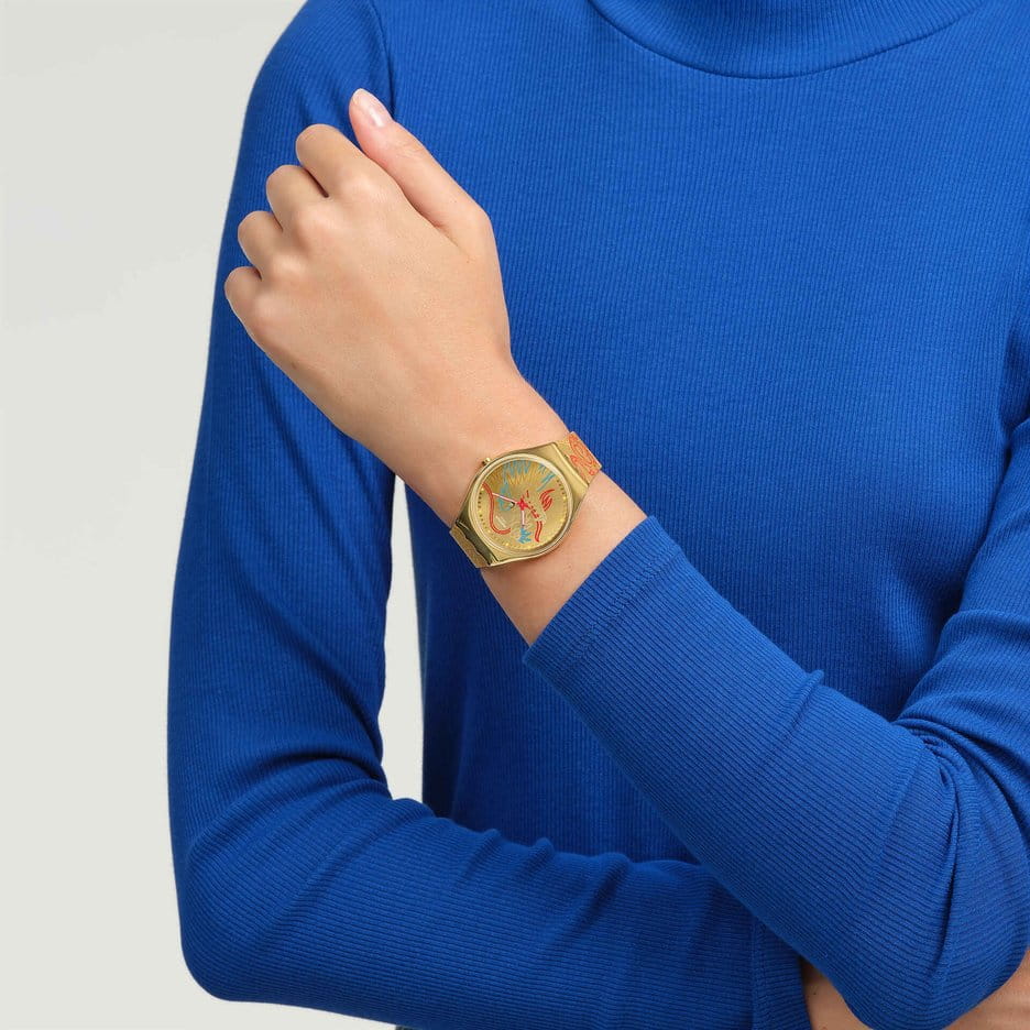 Часы Swatch SYXZ104 — это стильный и современный аксессуар для тех, кто ценит лёгкость и комфорт. Часы идеально подойдут как для мужчин, так и для женщин. Эти ультратонкие золотистые часы украшены разноцветным изображением дракона. Золотистый циферблат c PVDPVDУльтратонкое покрытие наносится в технике вакуумного напыления, сочетает в себе нитрид титана особой прочности со слоем золота или оксида хрома. Несёт в себе декоративную или защитную функцию. покрытием, с радиальной шлифовкой и принтом заключен в сияющий корпус и покрыт минеральным стекломМинеральное стеклоМинеральное стекло представляет собой искусственно выращенный минерал кварца. Такое стекло отличается особой устойчивостью к повреждениям и царапинам. Уступает по некоторым качествам сапфировому стеклу.. На золотистом ремешке с блестящей пряжкой в тон размещены два красных тренчика с надписями. На часовую, минутную стрелки розового цвета нанесено люминесцентное покрытиеЛюминесцентное покрытиеПозволяет считывать показания времени в темноте. Производители наносят на стрелки, часовые индексы, безель или поверхность циферблата светонакопительный состав, дающий холодное свечение., которое светится в темноте, создавая необычное изображение. Водозащита 30 метров делает часы практичными для повседневного использования. Эти часы подойдут для повседневного ношения и станут ярким акцентом в вашем наряде.