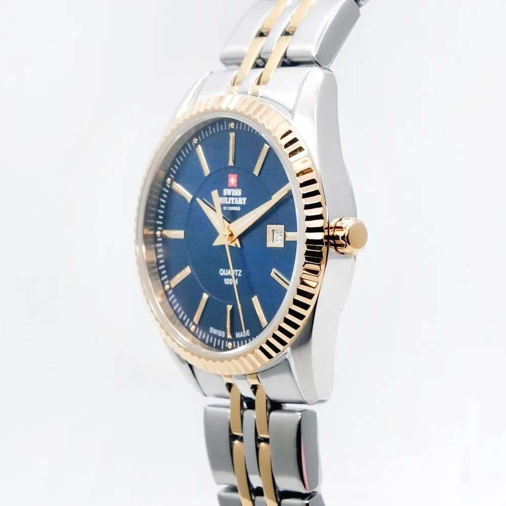 Женские швейцарские наручные часы Swiss Military by Chrono SM34066.09, кварцевый механизм с высокой точностью. Минеральное стеклоМинеральное стеклоМинеральное стекло представляет собой искусственно выращенный минерал кварца. Такое стекло отличается особой устойчивостью к повреждениям и царапинам. Уступает по некоторым качествам сапфировому стеклу. устойчивое к появлению царапин, обладающее высокой прозрачностью. Класс водозащиты: 50 метров, позволит защитить корпус от случайных брызг или капель дождя. Корпус часов изготовлен из стали.БезельБезельВнешний ободок, закрепляющий стекло. В спортивных часах так называется поворотное кольцо с делениями на циферблате, выполняет роль таймера – замеряет отрезки времени на шкале. Неподвижный безель – элемент декора. Однонаправленно вращающийся безель на дайверских часах позволяет фиксировать моменты погружения и выныривания на поверхность. с PVD-покрытиемPVDУльтратонкое покрытие наносится в технике вакуумного напыления, сочетает в себе нитрид титана особой прочности со слоем золота или оксида хрома. Несёт в себе декоративную или защитную функцию.. Браслет с раскладной застёжкойРаскладная застёжкаТакой тип застёжки используется только на браслетах из металла. Она никогда не раскрывается полностью, происходит разделение на 2 и более частей. Раскладывающая застёжка снизит вероятность потери часов к минимуму. и с частичным PVD-покрытиемPVDУльтратонкое покрытие наносится в технике вакуумного напыления, сочетает в себе нитрид титана особой прочности со слоем золота или оксида хрома. Несёт в себе декоративную или защитную функцию..