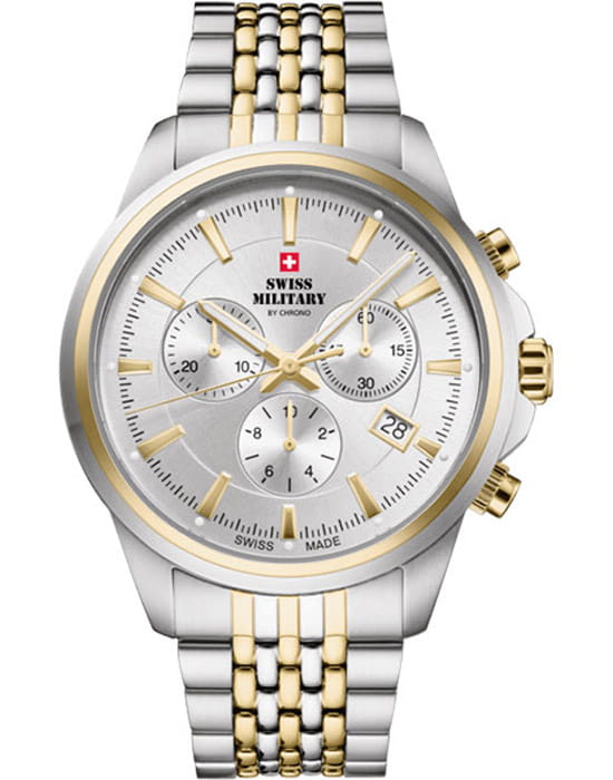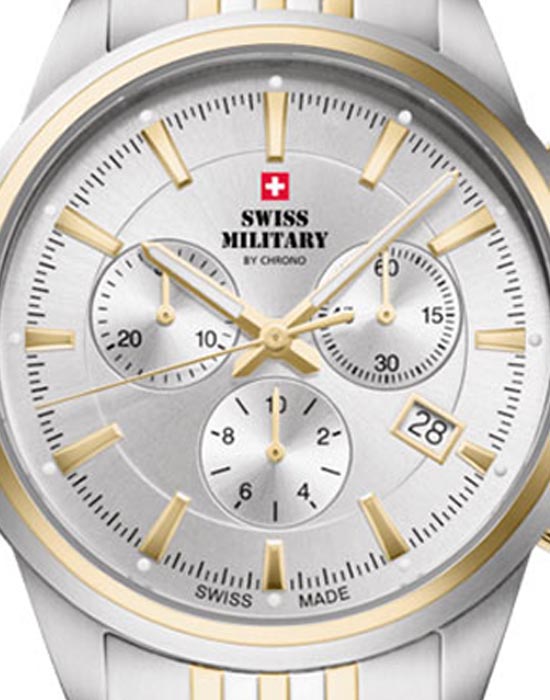 Часы Swiss Military SM34107.06 — это хронограф, сочетающий стиль и функциональность. Корпус диаметром 40 мм выполнен из нержавеющей стали, что обеспечивает долговечность и надёжность. Циферблат с солнечным узором украшен белыми люминесцентными индексамиЛюминесцентное покрытиеПозволяет считывать показания времени в темноте. Производители наносят на стрелки, часовые индексы, безель или поверхность циферблата светонакопительный состав, дающий холодное свечение. и стрелками, что позволяет легко считывать время в любых условиях. Защиту циферблата обеспечивает сапфировое стеклоСапфировое стеклоПрочный и надёжный материал из кристалла сапфира синтетического происхождения, характеризующийся особой твёрдостью и устойчивостью к царапинам и повреждениям., устойчивое к царапинам. БезельБезельВнешний ободок, закрепляющий стекло. В спортивных часах так называется поворотное кольцо с делениями на циферблате, выполняет роль таймера – замеряет отрезки времени на шкале. Неподвижный безель – элемент декора. Однонаправленно вращающийся безель на дайверских часах позволяет фиксировать моменты погружения и выныривания на поверхность. с PVD-покрытиемPVDУльтратонкое покрытие наносится в технике вакуумного напыления, сочетает в себе нитрид титана особой прочности со слоем золота или оксида хрома. Несёт в себе декоративную или защитную функцию.. Водозащита до 10 ATM делает часы подходящими для плавания и других водных активностей. Швейцарский кварцевый механизм обеспечивает высокую точность измерения времени и функции хронографа. Стальной браслет с PVD-покрытиемPVDУльтратонкое покрытие наносится в технике вакуумного напыления, сочетает в себе нитрид титана особой прочности со слоем золота или оксида хрома. Несёт в себе декоративную или защитную функцию. на раскладной застёжкеРаскладная застёжкаТакой тип застёжки используется только на браслетах из металла. Она никогда не раскрывается полностью, происходит разделение на 2 и более частей. Раскладывающая застёжка снизит вероятность потери часов к минимуму. гарантирует комфортное ношение и надёжную фиксацию. Часы сопровождаются 5-летней международной гарантией, подтверждающей их высокое качество и надёжность. Swiss Military — это идеальный выбор для мужчин, которые ценят швейцарское качество и ведут активный образ жизни.