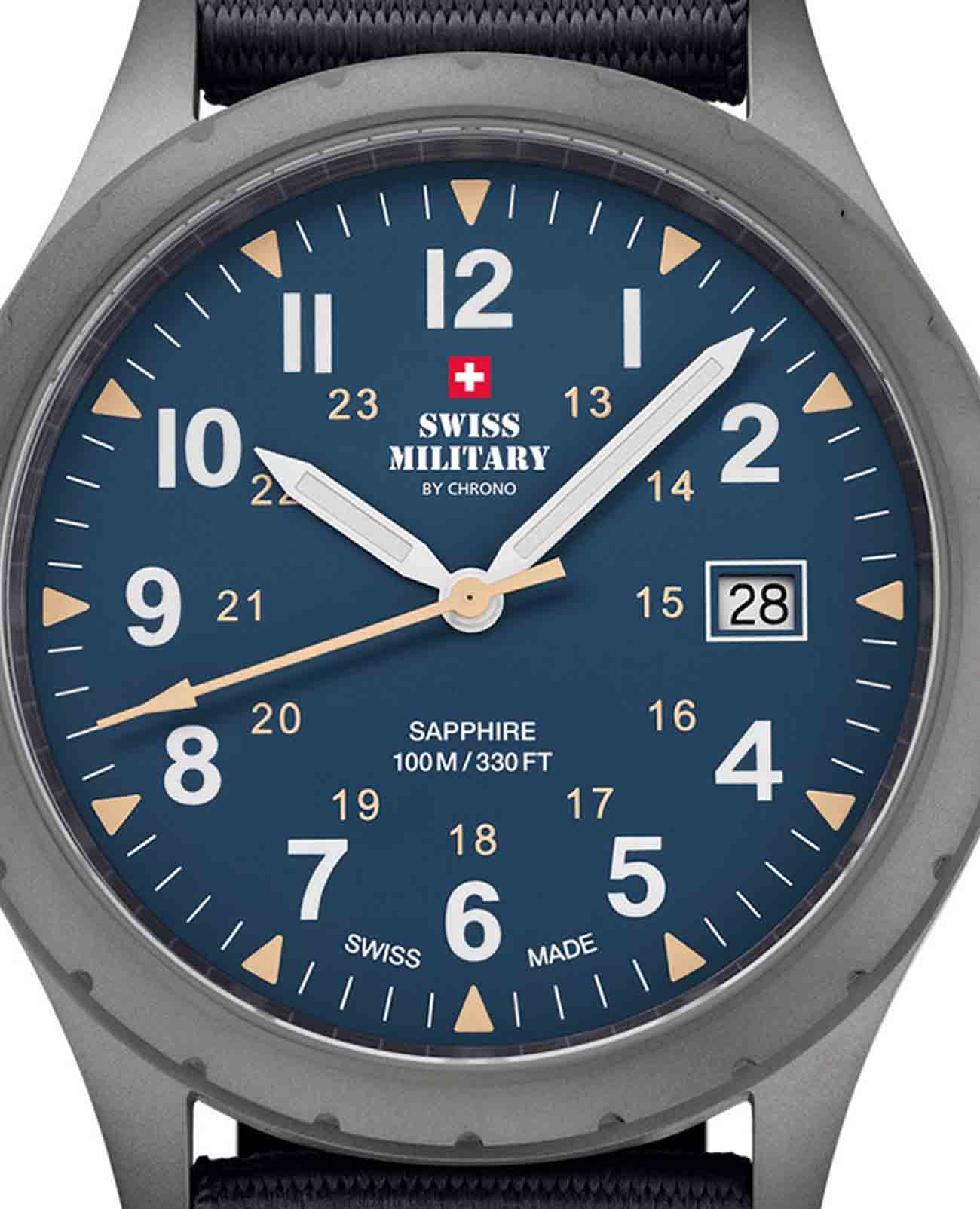 Модель SM34108.05 от Swiss Military by Chrono — это надёжные швейцарские часы в классическом армейском стиле, сочетающие функциональность и сдержанный дизайн. Корпус выполнен из нержавеющей стали с PVD-покрытиемPVDУльтратонкое покрытие наносится в технике вакуумного напыления, сочетает в себе нитрид титана особой прочности со слоем золота или оксида хрома. Несёт в себе декоративную или защитную функцию., подчёркивая прочность и элегантность конструкции. Циферблат с арабскими цифрами обеспечивает отличную читаемость, а функция отображения даты добавляет практичности. Часы оснащены кварцевым механизмом, обеспечивающим точный ход. Циферблат защищён сапфировым стекломСапфировое стеклоПрочный и надёжный материал из кристалла сапфира синтетического происхождения, характеризующийся особой твёрдостью и устойчивостью к царапинам и повреждениям., устойчивым к царапинам. Тканевый ремешок на стандартной застежке для надёжной фиксации на запястье. Модель обладает водонепроницаемостью до 100 метров, что делает её подходящей для плавания и сноркелинга.