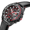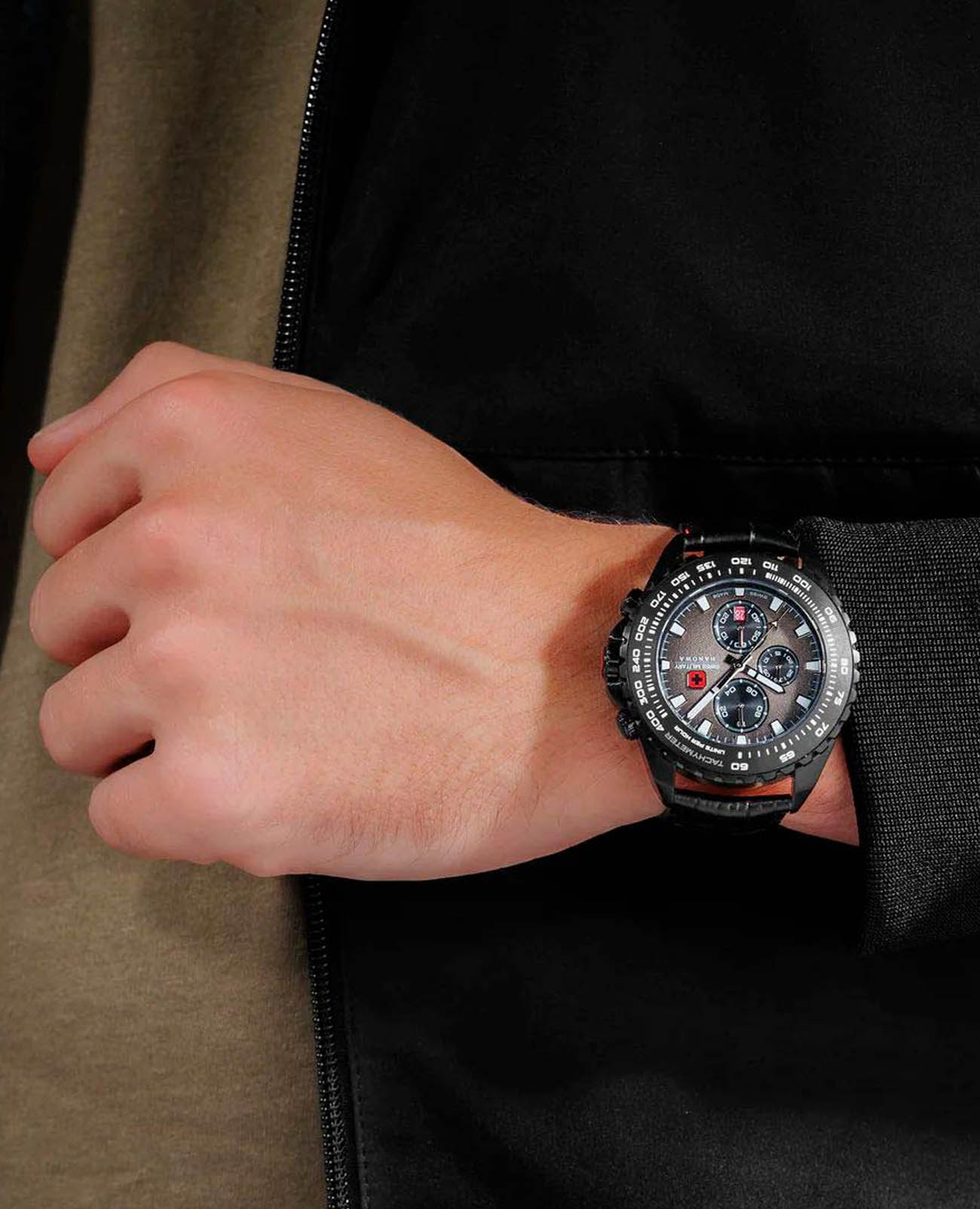 Мужские швейцарские часы- хронографХронографФункция позволяет измерять отрезки времени с особой точностью: часы, минуты, секунды. Верным признаком хронографа является наличие на циферблате 3 дополнительных окошек-счётчиков. с секундомеромСекундомерСекундоме́р — прибор, способный измерять интервалы времени с точностью до долей секунды. Swiss Military Hanowa Stone Marten SMWGC0001832, кварцевый механизм с высокой точностью. Сапфировое стеклоСапфировое стеклоПрочный и надёжный материал из кристалла сапфира синтетического происхождения, характеризующийся особой твёрдостью и устойчивостью к царапинам и повреждениям. устойчивое к появлению царапин, обладающее высокой прозрачностью. Корпус часов изготовлен из нержавеющей стали с IP-покрытиемIP-покрытиеМетод ионного напыления. Демонстрирует повышенную устойчивость к истиранию, окислению и химическим веществам. Под воздействием высокого давления и температуры около 1500°C молекулы металла надёжно соединяются с частицами корпуса часов.. Неподвижный безельБезельВнешний ободок, закрепляющий стекло. В спортивных часах так называется поворотное кольцо с делениями на циферблате, выполняет роль таймера – замеряет отрезки времени на шкале. Неподвижный безель – элемент декора. Однонаправленно вращающийся безель на дайверских часах позволяет фиксировать моменты погружения и выныривания на поверхность. из стали с IP-покрытиемIP-покрытиеМетод ионного напыления. Демонстрирует повышенную устойчивость к истиранию, окислению и химическим веществам. Под воздействием высокого давления и температуры около 1500°C молекулы металла надёжно соединяются с частицами корпуса часов. и шкалой тахиметрТахиметрРазмеченная шкала, располагается на ободке или безеле часов. Тахиметр позволяет рассчитать скорость на определённом участке пути, расстояние измеряется в километрах или милях.. Стрелки и метки с люминесцентным покрытиемЛюминесцентное покрытиеПозволяет считывать показания времени в темноте. Производители наносят на стрелки, часовые индексы, безель или поверхность циферблата светонакопительный состав, дающий холодное свечение.. Класс водозащиты: 100 метров, позволит плавать, нырять и заниматься другими водными видами спорта. Кожаный ремешок на стандартной застежке.