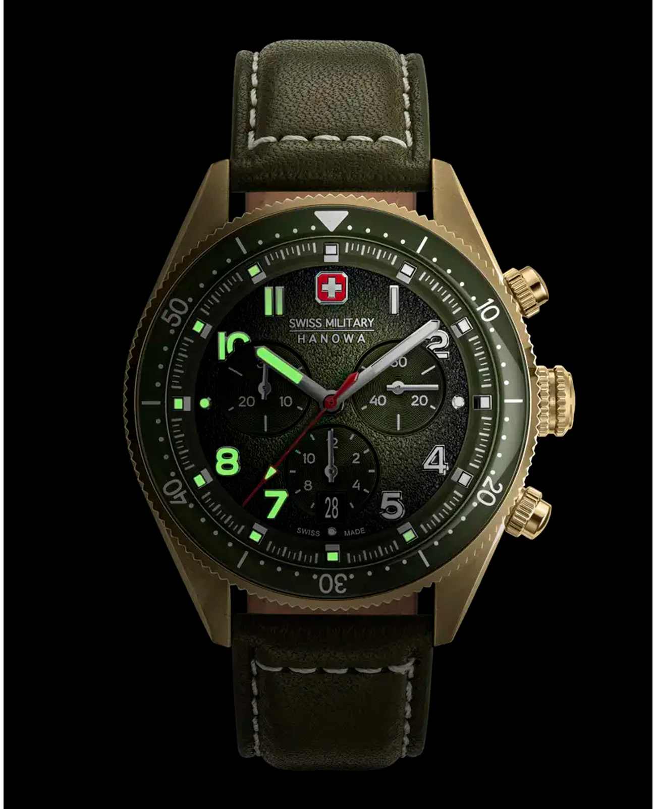 Мужские наручные часы-хронографХронографФункция позволяет измерять отрезки времени с особой точностью: часы, минуты, секунды. Верным признаком хронографа является наличие на циферблате 3 дополнительных окошек-счётчиков. Swiss Military Hanowa SMWGC0003802 из коллекции Greyhound Chrono сочетают в себе спортивный дизайн и надежность современных технологий. Модель обладает круглым корпусом диаметром 45 мм, изготовленным из нержавеющей стали, что обеспечивает высокую устойчивость к внешним воздействиям. Для защиты циферблата используется сапфировое стеклоСапфировое стеклоПрочный и надёжный материал из кристалла сапфира синтетического происхождения, характеризующийся особой твёрдостью и устойчивостью к царапинам и повреждениям., гарантирующее прочную защиту от царапин. БезельБезельВнешний ободок, закрепляющий стекло. В спортивных часах так называется поворотное кольцо с делениями на циферблате, выполняет роль таймера – замеряет отрезки времени на шкале. Неподвижный безель – элемент декора. Однонаправленно вращающийся безель на дайверских часах позволяет фиксировать моменты погружения и выныривания на поверхность. с IP-покрытиемIP-покрытиеМетод ионного напыления. Демонстрирует повышенную устойчивость к истиранию, окислению и химическим веществам. Под воздействием высокого давления и температуры около 1500°C молекулы металла надёжно соединяются с частицами корпуса часов.. Часы оснащены высококачественным швейцарским кварцевым механизмом Ronda 5030, который позволяет точно измерять время благодаря функции секундомераСекундомерСекундоме́р — прибор, способный измерять интервалы времени с точностью до долей секунды.. Циферблат украшен метками в виде арабских цифр и точек, а стрелки и метки покрыты люминесцентным покрытиемЛюминесцентное покрытиеПозволяет считывать показания времени в темноте. Производители наносят на стрелки, часовые индексы, безель или поверхность циферблата светонакопительный состав, дающий холодное свечение., что обеспечивает удобство чтения времени в темноте. Ремешок часов выполнен из натуральной кожи, что добавляет комфорта при длительном ношении. Модель также оснащена окном даты в положении «6 часов», завинчивающейся заводной головкой и имеет водонепроницаемость до 10 атмосфер (100 метров), что позволяет использовать их во время плавания и других водных видов спорта.