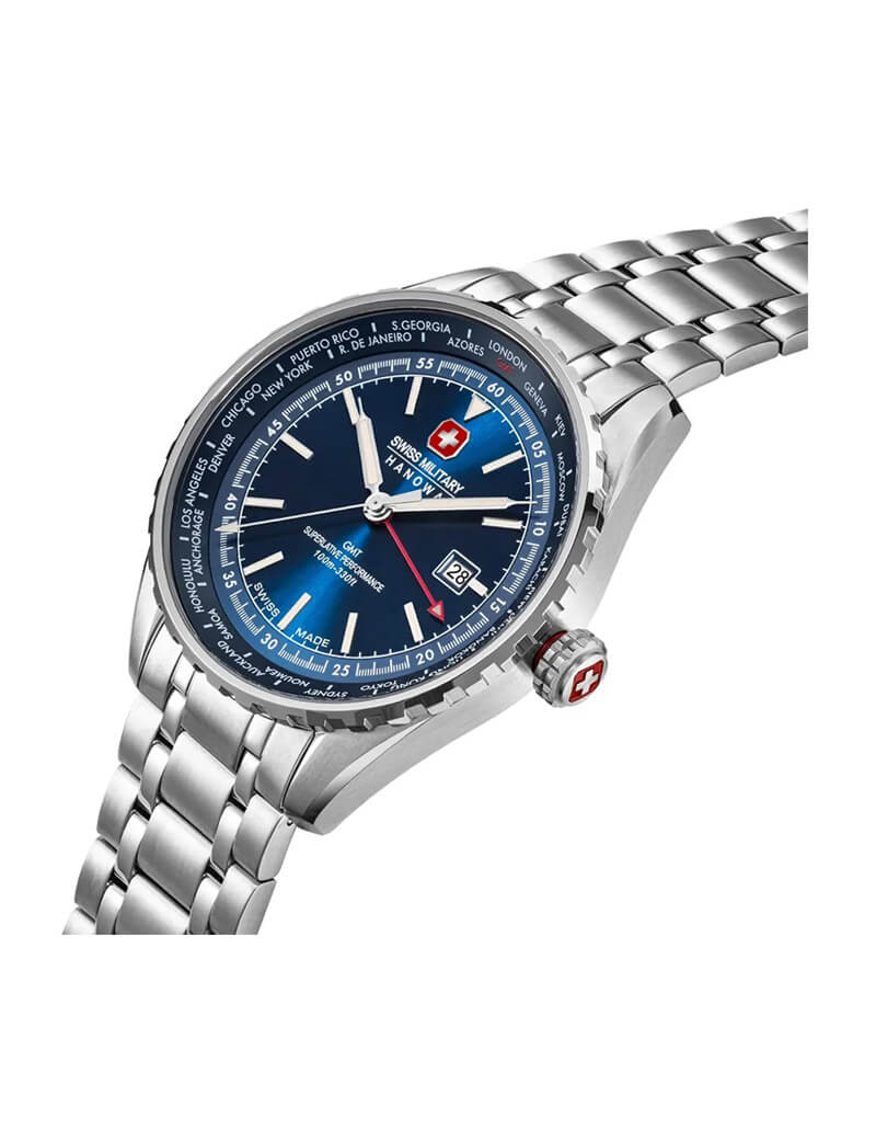 Мужские швейцарские часы с сапфировым стекломСапфировое стеклоПрочный и надёжный материал из кристалла сапфира синтетического происхождения, характеризующийся особой твёрдостью и устойчивостью к царапинам и повреждениям. Swiss Military Hanowa SMWGH0003204, кварцевый механизм с высокой точностью. Сапфировое стеклоСапфировое стеклоПрочный и надёжный материал из кристалла сапфира синтетического происхождения, характеризующийся особой твёрдостью и устойчивостью к царапинам и повреждениям. устойчивое к появлению царапин, обладающее высокой прозрачностью. Корпус часов изготовлен из стали. Окошко даты находится в положении 3 часа. Стрелки и метки с люминесцентным покрытиемЛюминесцентное покрытиеПозволяет считывать показания времени в темноте. Производители наносят на стрелки, часовые индексы, безель или поверхность циферблата светонакопительный состав, дающий холодное свечение.. Класс водозащиты: 100 метров, позволит плавать, нырять и заниматься другими водными видами спорта. Стальной браслет на раскладной застёжкеРаскладная застёжкаТакой тип застёжки используется только на браслетах из металла. Она никогда не раскрывается полностью, происходит разделение на 2 и более частей. Раскладывающая застёжка снизит вероятность потери часов к минимуму..