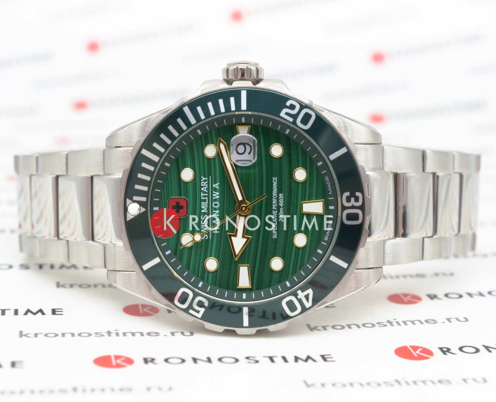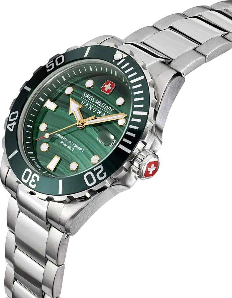 Swiss Military Hanowa Greyhound SMWGH0005804 — воплощение швейцарского качества и элегантного дизайна. Лимитированная серия — 444 экземпляра. Эти часы идеально подойдут для уверенного в себе мужчины, ценящего стиль и надежность. Корпус часов выполнен из нержавеющей стали, что придает им современный и мужественный вид. Диаметр корпуса составляет 44 мм, что делает их универсальным аксессуаром для любого случая. Циферблат из натурального малахита, метки и стрелки светятся в темноте благодаря люминесцентному покрытиюЛюминесцентное покрытиеПозволяет считывать показания времени в темноте. Производители наносят на стрелки, часовые индексы, безель или поверхность циферблата светонакопительный состав, дающий холодное свечение. обеспечивает отличную читаемость и подчеркивает строгий стиль модели. Сапфировое стеклоСапфировое стеклоПрочный и надёжный материал из кристалла сапфира синтетического происхождения, характеризующийся особой твёрдостью и устойчивостью к царапинам и повреждениям. защищает циферблат от царапин и повреждений, гарантируя долгий срок службы и сохранение первоначального внешнего вида часов. Часы оснащены надежным кварцевым механизмом, который обеспечивает высокую точность хода. Водозащита на уровне 200WR позволит плавать, нырять и заниматься другими водными видами спорта. Вращающийся в одном направлении рифленый безельБезельВнешний ободок, закрепляющий стекло. В спортивных часах так называется поворотное кольцо с делениями на циферблате, выполняет роль таймера – замеряет отрезки времени на шкале. Неподвижный безель – элемент декора. Однонаправленно вращающийся безель на дайверских часах позволяет фиксировать моменты погружения и выныривания на поверхность. с IP-покрытиемIP-покрытиеМетод ионного напыления. Демонстрирует повышенную устойчивость к истиранию, окислению и химическим веществам. Под воздействием высокого давления и температуры около 1500°C молекулы металла надёжно соединяются с частицами корпуса часов.. Стальной браслет на раскладной застёжкеРаскладная застёжкаТакой тип застёжки используется только на браслетах из металла. Она никогда не раскрывается полностью, происходит разделение на 2 и более частей. Раскладывающая застёжка снизит вероятность потери часов к минимуму. обеспечивает комфортное ношение на запястье.