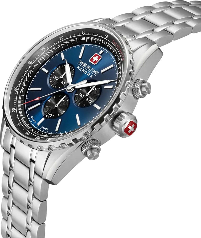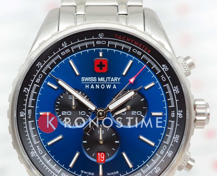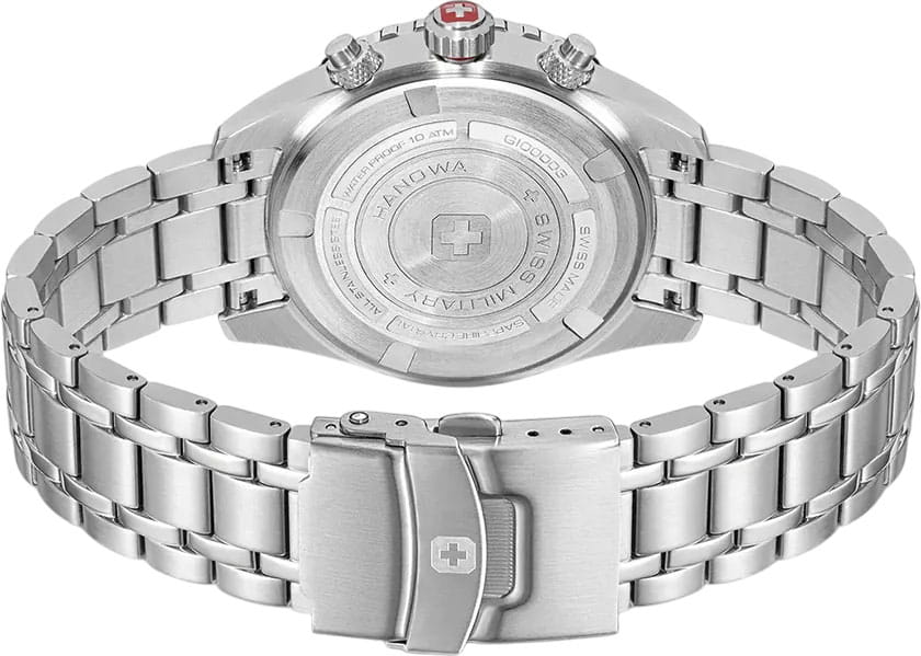 Мужские швейцарские часы Swiss Military Hanowa Afterburn Chrono SMWGI0000308 с хронографомХронографФункция позволяет измерять отрезки времени с особой точностью: часы, минуты, секунды. Верным признаком хронографа является наличие на циферблате 3 дополнительных окошек-счётчиков. и секундомеромСекундомерСекундоме́р — прибор, способный измерять интервалы времени с точностью до долей секунды.. Сапфировое стеклоСапфировое стеклоПрочный и надёжный материал из кристалла сапфира синтетического происхождения, характеризующийся особой твёрдостью и устойчивостью к царапинам и повреждениям. с антибликовым покрытием защищает циферблат от царапин и обеспечивает отличную читаемость при любом освещении. Корпус из нержавеющей стали диаметром 44 мм сбалансирован и элегантен. Браслет с раскладной застёжкойРаскладная застёжкаТакой тип застёжки используется только на браслетах из металла. Она никогда не раскрывается полностью, происходит разделение на 2 и более частей. Раскладывающая застёжка снизит вероятность потери часов к минимуму. идеально дополняют дизайн часов, обеспечивая комфортное ношение. Люминесцентное покрытиеЛюминесцентное покрытиеПозволяет считывать показания времени в темноте. Производители наносят на стрелки, часовые индексы, безель или поверхность циферблата светонакопительный состав, дающий холодное свечение. стрелок и меток позволит вам следить за временем даже в полной темноте. Стальной безельБезельВнешний ободок, закрепляющий стекло. В спортивных часах так называется поворотное кольцо с делениями на циферблате, выполняет роль таймера – замеряет отрезки времени на шкале. Неподвижный безель – элемент декора. Однонаправленно вращающийся безель на дайверских часах позволяет фиксировать моменты погружения и выныривания на поверхность. с PVD-покрытиемPVDУльтратонкое покрытие наносится в технике вакуумного напыления, сочетает в себе нитрид титана особой прочности со слоем золота или оксида хрома. Несёт в себе декоративную или защитную функцию.. Часы оснащены центральной секундной стрелкой и окошком даты в положении «6 часов», что делает их функциональными для повседневного использования. ТахиметрТахиметрРазмеченная шкала, располагается на ободке или безеле часов. Тахиметр позволяет рассчитать скорость на определённом участке пути, расстояние измеряется в километрах или милях. по внешнему краю. Водонепроницаемость до 100 метров. Идеальный выбор для тех, кто ценит качество и долговечность.