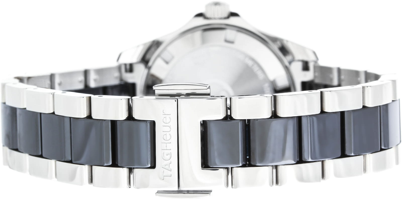 TAG Heuer Aquaracer WAY131A.BA0913 — элегантные женские часы, сочетающие стиль и функциональность. Корпус диаметром 35 мм и толщиной 10,75 мм выполнен из полированной нержавеющей стали, обеспечивая долговечность и устойчивость к коррозии. Чёрный лакированный циферблат оснащён накладными часовыми метками и стрелками с люминесцентным покрытиемЛюминесцентное покрытиеПозволяет считывать показания времени в темноте. Производители наносят на стрелки, часовые индексы, безель или поверхность циферблата светонакопительный состав, дающий холодное свечение., обеспечивающим отличную читаемость в любых условиях освещения. Его поверхность защищена сапфировым стекломСапфировое стеклоПрочный и надёжный материал из кристалла сапфира синтетического происхождения, характеризующийся особой твёрдостью и устойчивостью к царапинам и повреждениям., устойчивым к царапинам. Часы оснащены точным кварцевым механизмом, обеспечивающим стабильное отображение времени. Функциональность включает индикацию часов, минут, секунд и даты, расположенной на отметке «3 часа». БезельБезельВнешний ободок, закрепляющий стекло. В спортивных часах так называется поворотное кольцо с делениями на циферблате, выполняет роль таймера – замеряет отрезки времени на шкале. Неподвижный безель – элемент декора. Однонаправленно вращающийся безель на дайверских часах позволяет фиксировать моменты погружения и выныривания на поверхность. однонаправленный вращающийся, выполнен из стали и чёрной керамики, устойчивой к царапинам. Водозащита до 300 метров (30 бар) делает модель подходящей для дайвинга и активного образа жизни. Браслет комбинированный, выполнен из полированной нержавеющей стали и чёрной керамики, оснащён застёжкой-бабочкой с кнопкамиЗастёжка "бабочка"Такой вид застёжки дополняется предохранителями, помогающими избежать случайного раскрытия браслета. Обладают изящным исполнением. .с кнопками для дополнительной безопасности.